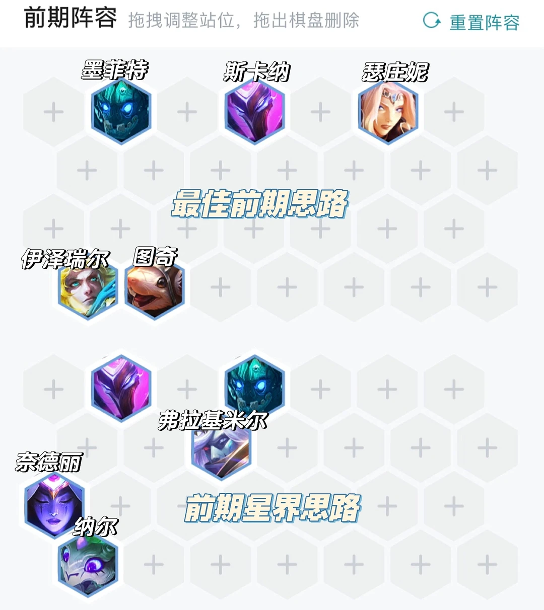 前期思路是冒险斗射最佳,体系牌不用大变转型起来也相对容易。如果有三星级且质量还不错可以靠星界快速上8,总之能连胜大于一切,不能连胜就把经济最大化即可。
