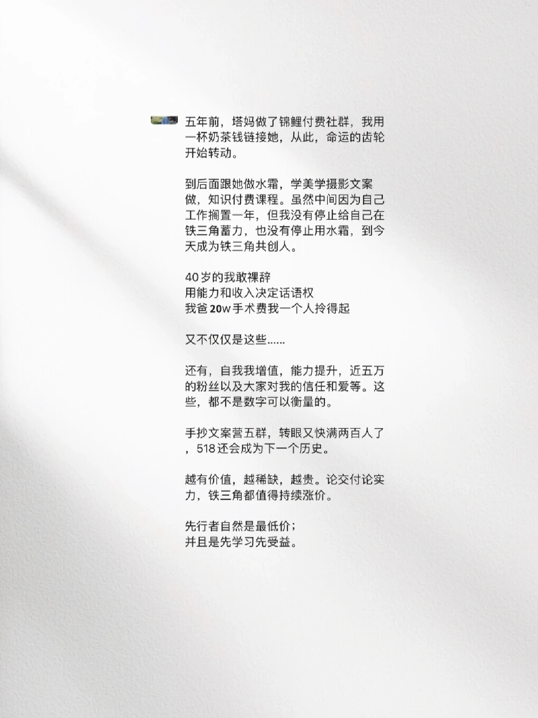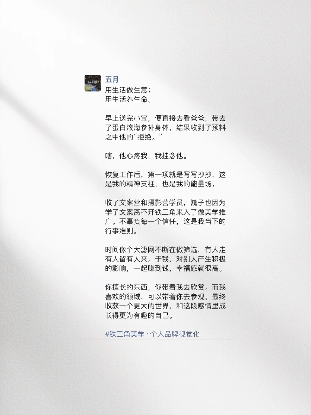 二胎后因为异地工作选择回归家庭,我不要了。但,过着掌心向上的日子不好受,觉醒后深耕自己,学美学,摄影,文案,练就了这些谋生本领。队友的钱,我不要了。