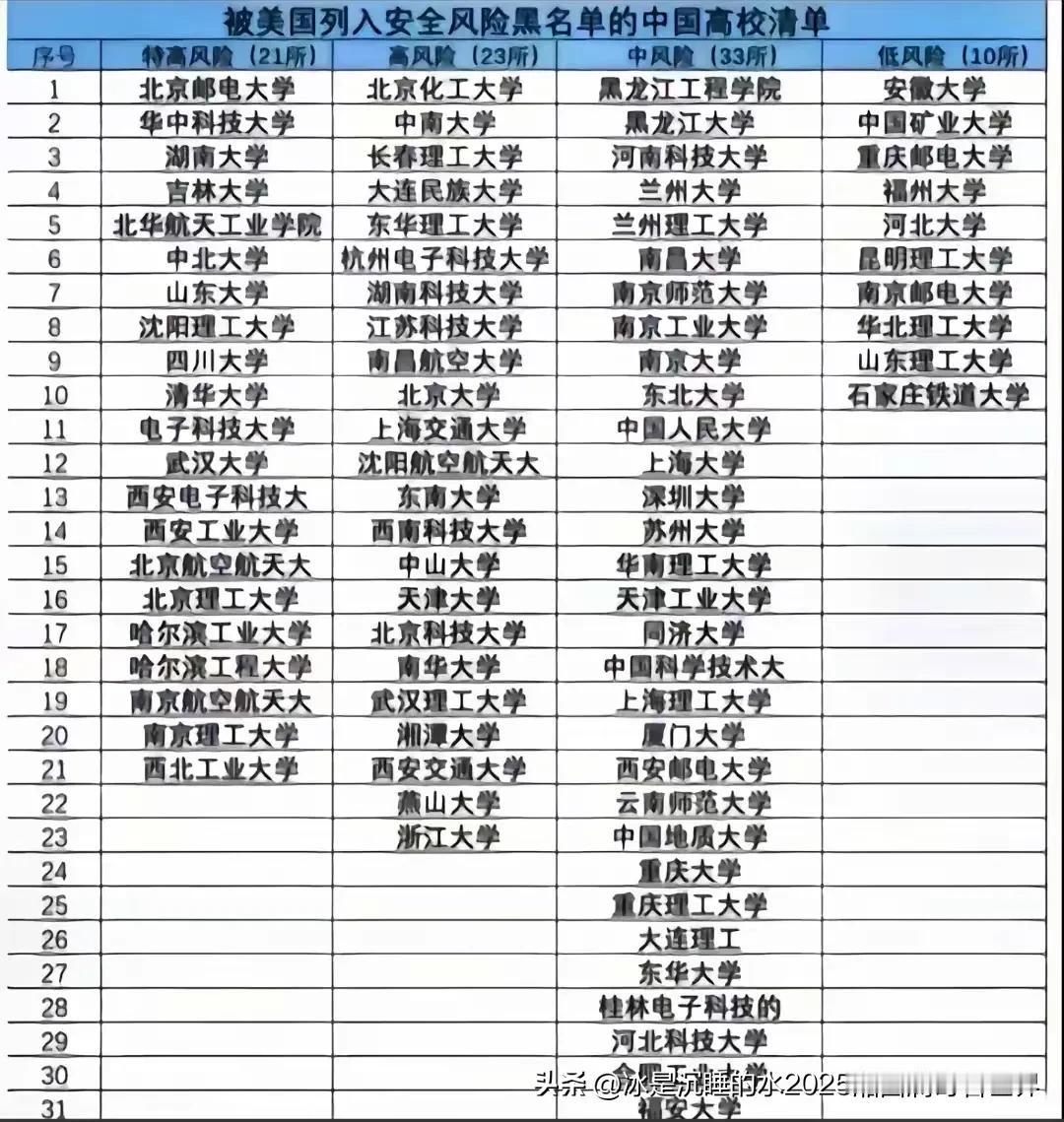 转发分享2张据说是已经进入美国国防部打压制裁黑名单的中国高新企业、中国高校名单。当然,这个是国内非官方自媒体搞的,没有经过官方证实,仅供大家参考、娱乐,不予证实,尤其是高校名单里居然还有武大,我就觉得不靠谱。 国人当自强,只有自身强大,任何外部势力干扰打压都是枉然。