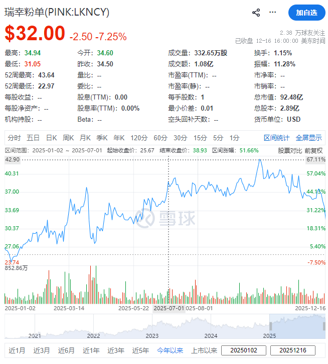 截至12月16日收市,瑞幸咖啡每股报32美元,总市值约92.48亿美元。