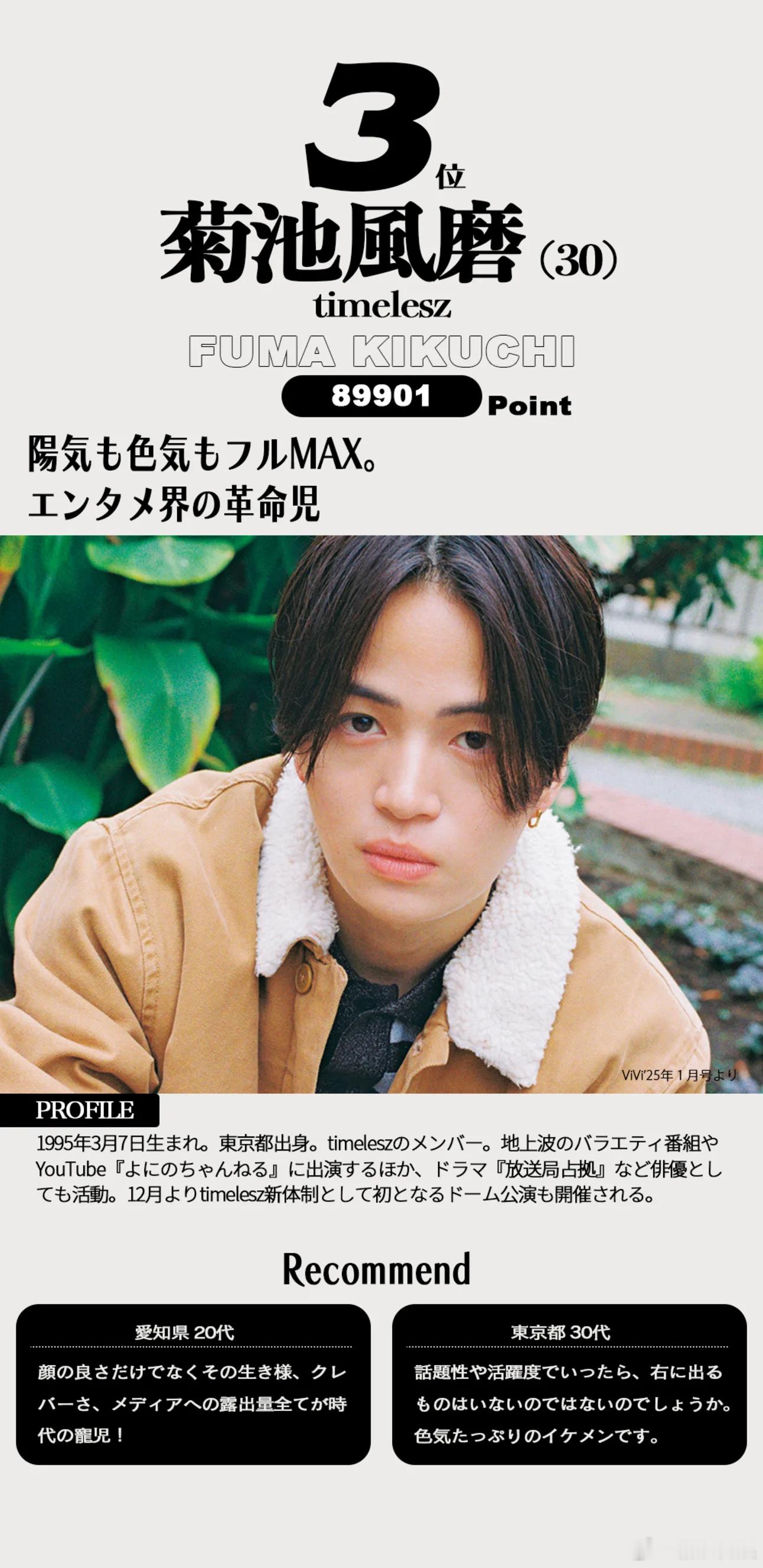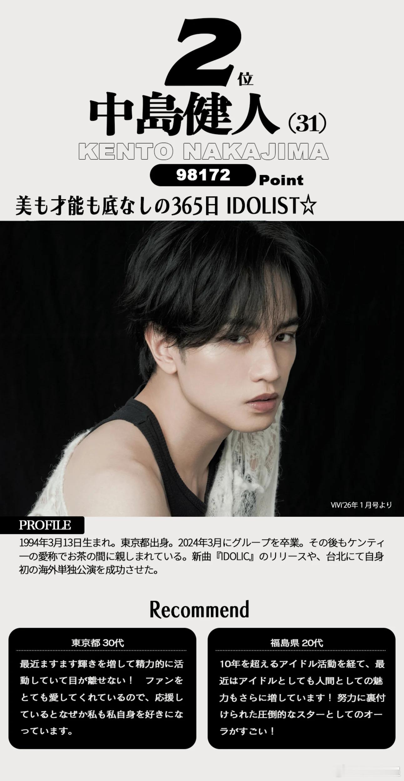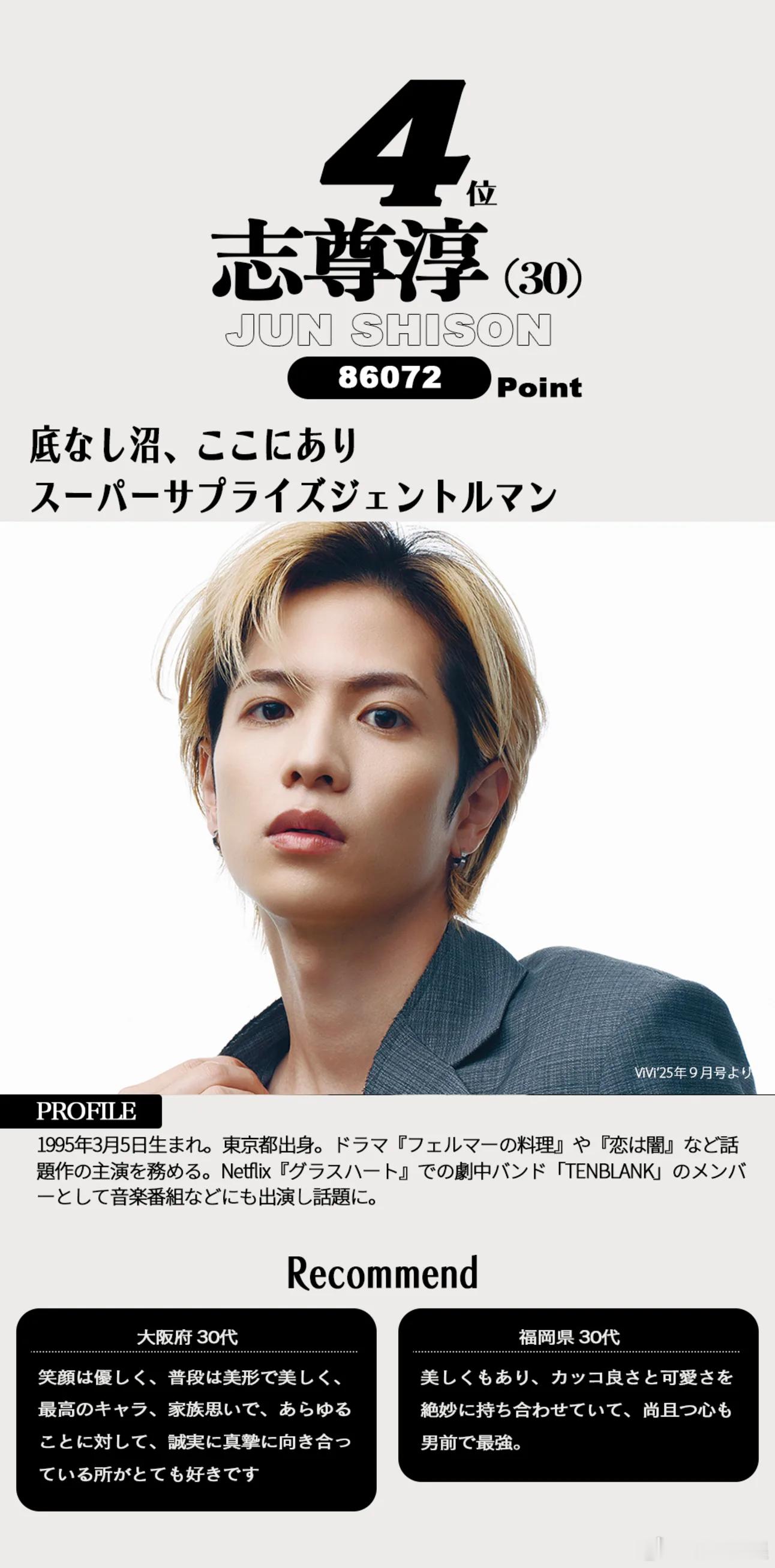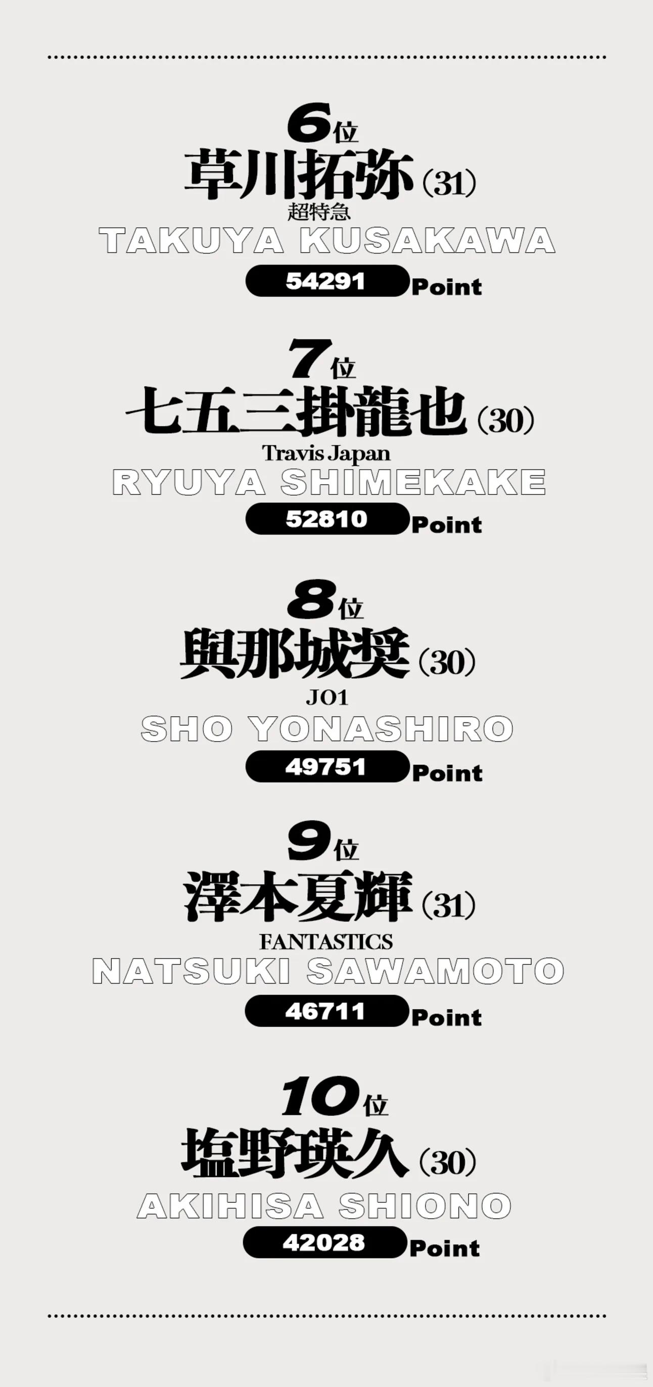 日本国宝级帅哥 2025下半年ViVi国宝级帅哥全部排行榜发表,松村北斗(SixTONES )首次获得30岁以上的ADULT部门第一,达成榜单历史首个全部门大满贯!1位 松村北斗 (SixTONES2位 中岛健人3位 菊池风磨(timelesz)4位 志尊淳5位 末泽诚也(aegroup)6位 草川拓弥(超特急)7位 七五三挂龙也(travisjapan )8位 与那城奖(JO1)9位 泽本夏辉(FANTASTICS)10位 盐野瑛久