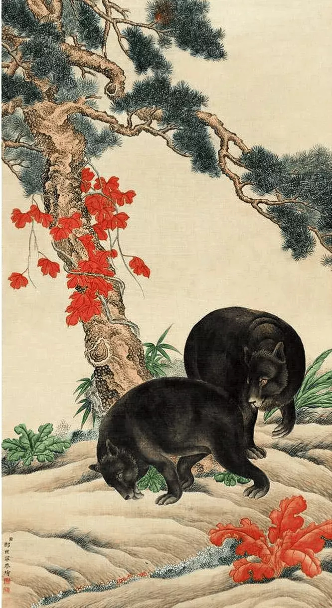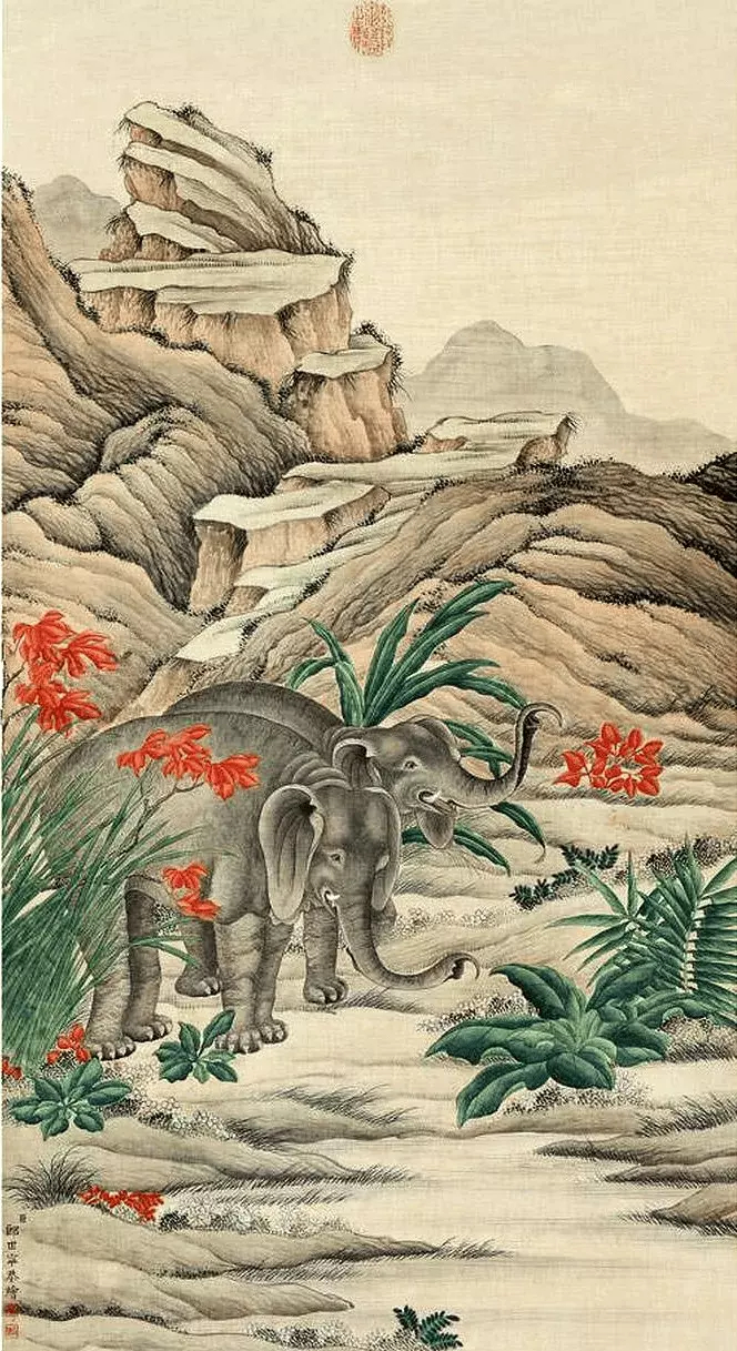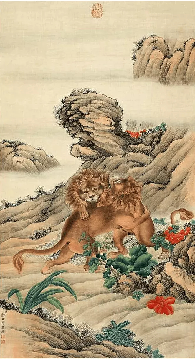 清 郎世宁《溪山瑞兽图》四条屏。画中分别描绘了四种瑞兽成双成对,分别是熊、象、狮子、牛。郎世宁是清代早期的著名宫廷画家,意大利人,在康熙末年随传教士来到中国,历经了清初最繁荣的康雍乾三代。郎世宁的绘画才华在乾隆朝才得以尽情施展,受到了乾隆皇帝的宠信,进入宫廷画院如意馆中专职创作。这就是中国风遇见艺术