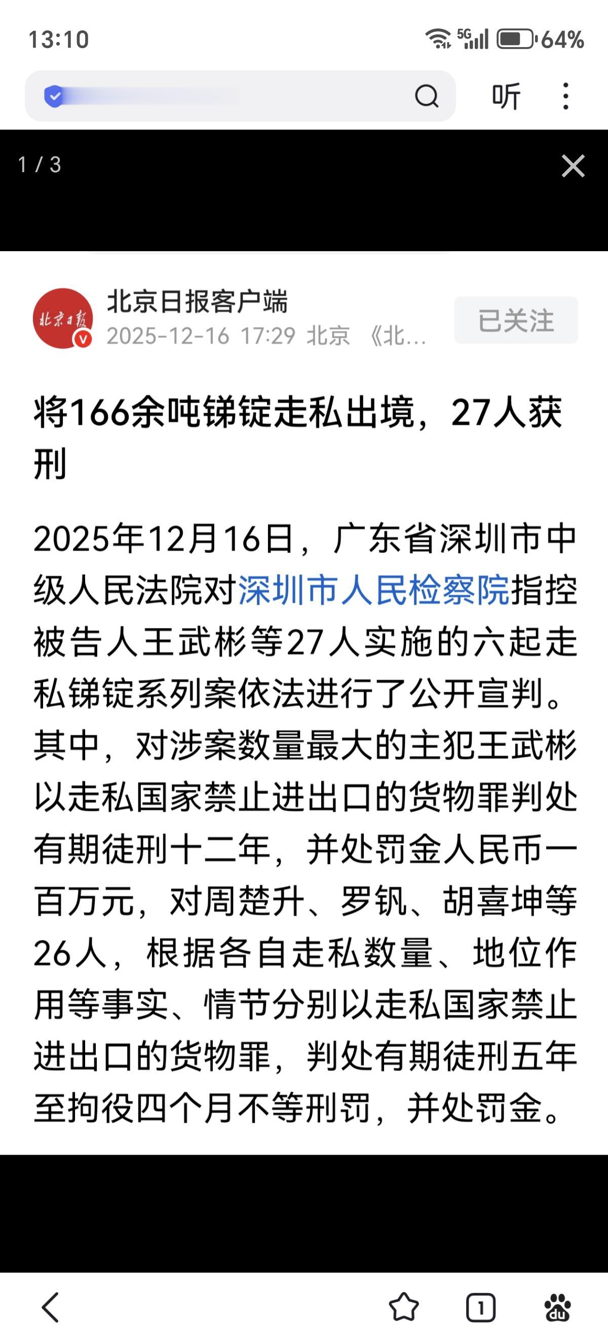 2025年2月至3月期间,王武彬与境外走私团伙合谋或接受委托,组织部分被告人分别帮其购买锑锭、夹藏伪装、虚假申报等,将锑锭走私出境。周楚升、罗钒、胡喜坤等人以夹藏伪装、虚假申报等方式,实施、参与走私锑锭犯罪。全案共计走私锑锭166余吨,海关查扣96余吨。 深圳市中级人民法院对主犯王武彬以走私国家禁止进出口的货物罪判处有期徒刑十二年,并处罚金人民币一百万元,对周楚升、罗钒、胡喜坤等26人判处有期徒刑五年至拘役四个月不等刑罚,并处罚金。