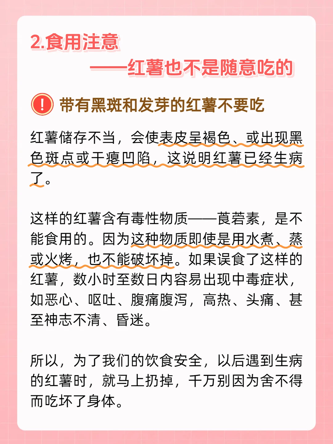 所以,坏了的红薯一定要及时扔掉,别因为舍不得而吃坏了身体哦!