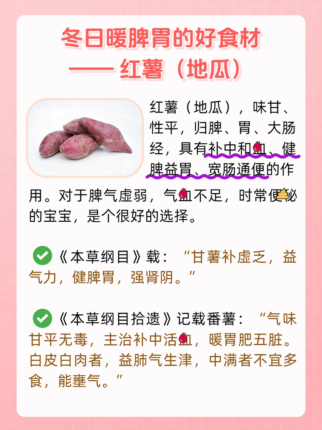 红薯(地瓜),味甘、性平,归脾、胃、大肠经,具有补中和🩸、健脾益胃、宽肠通便的作用,对于脾气虚弱,气🩸不足,时常便[大便R]秘的宝宝,是个很好的选择。