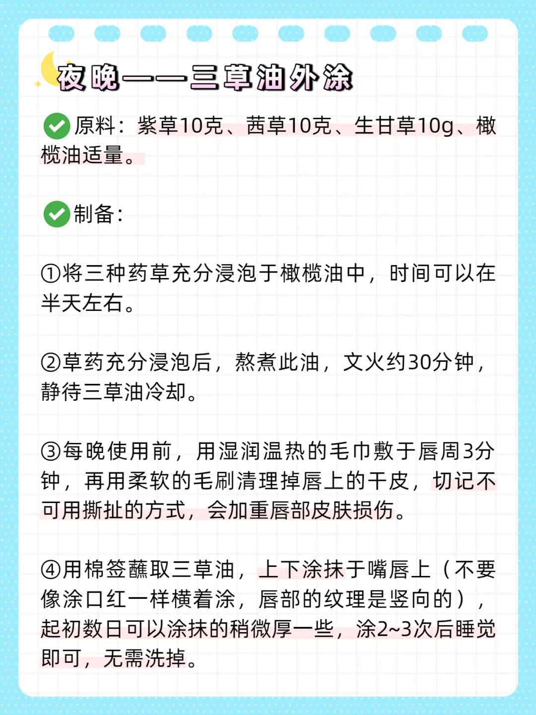 ③每晚使用前,用湿润温热的毛巾敷于唇周3分钟,再用柔软的毛刷清理掉唇上的干皮,切记不可用撕扯的方式,会加重唇部皮肤损伤。