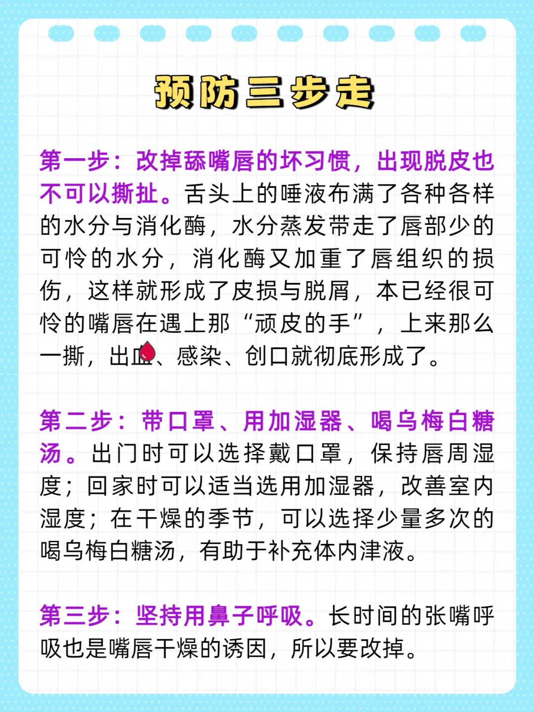 第一步:改掉舔嘴唇的坏习惯,出现脱皮也不可以撕扯。舌头上的唾液布满了各种各样的水分与消化酶,水分蒸发带走了唇部少的可怜的水分,消化酶又加重了唇组织的损伤,这样就形成了皮损与脱屑,本已经很可怜的嘴唇在遇上那“顽皮的手”,上来那么一撕,出血、感染、创口就彻底形成了。