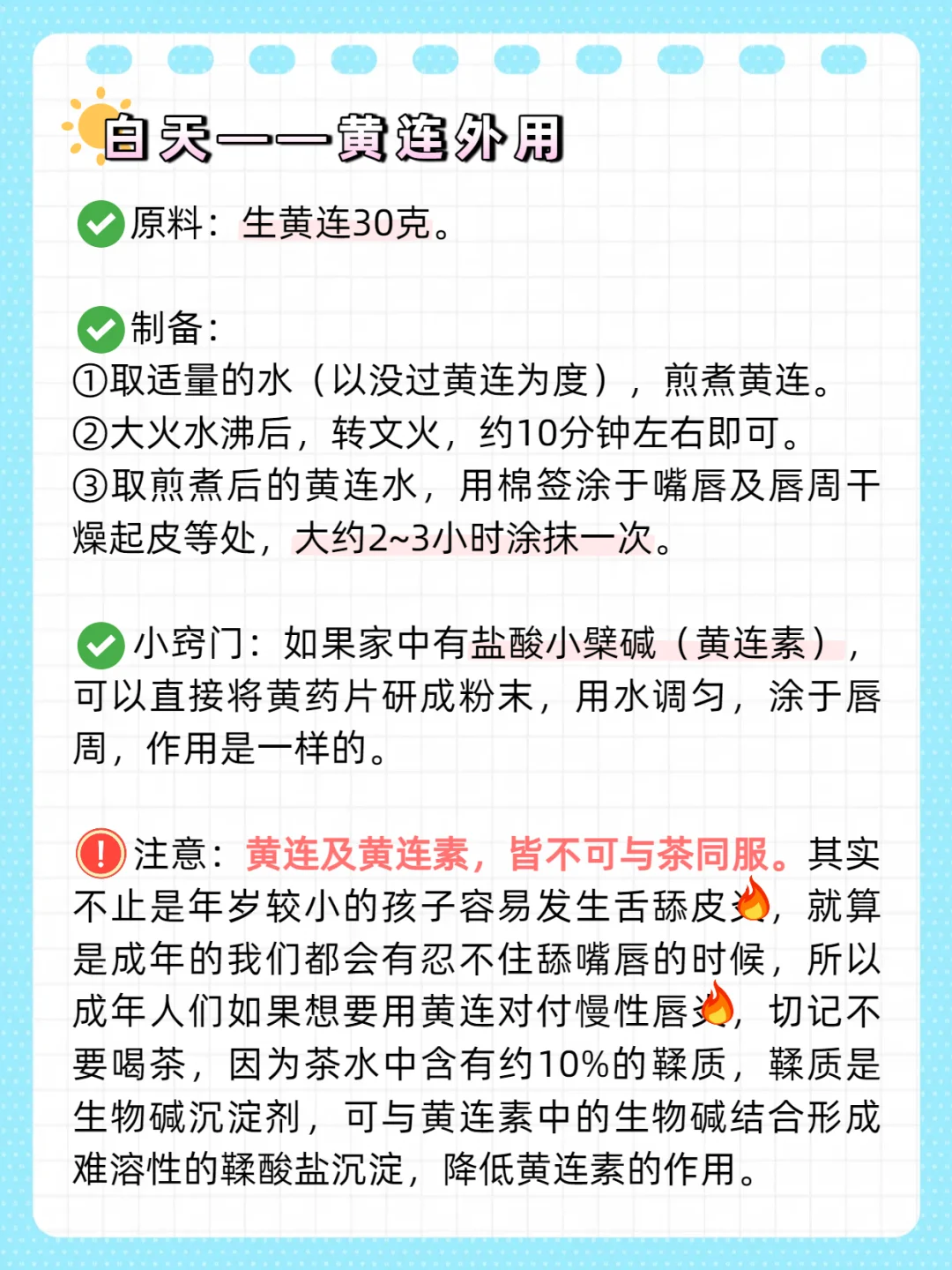 ③取煎煮后的黄连水,用棉签涂于嘴唇及唇周干燥起皮等处,大约2~3小时涂抹一次。