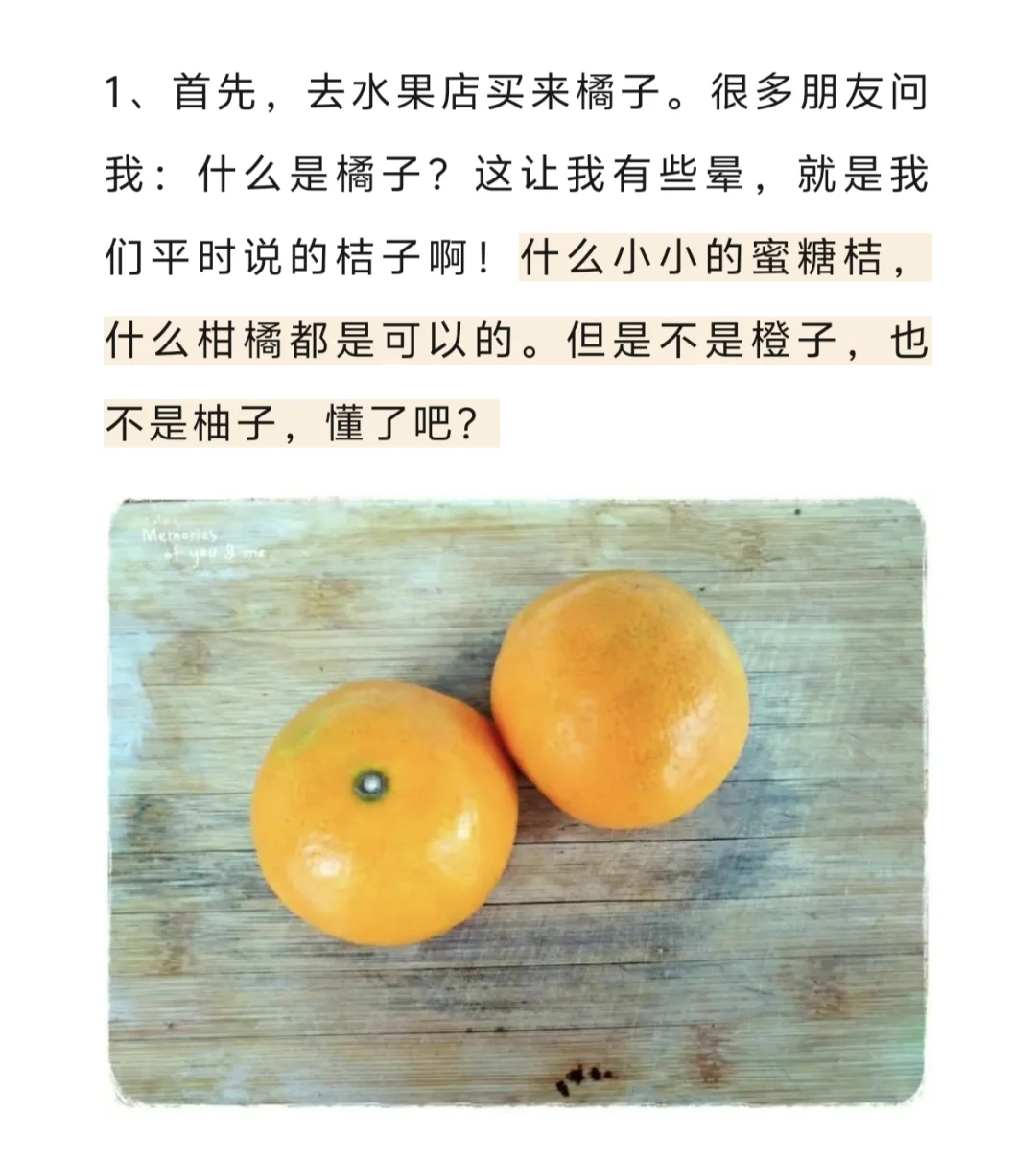 1、首先,去水果店买来橘子。就是我们平时说的桔子,什么小小的蜜糖桔,什么柑橘都是可以的。但是不是橙子,也不是柚子。