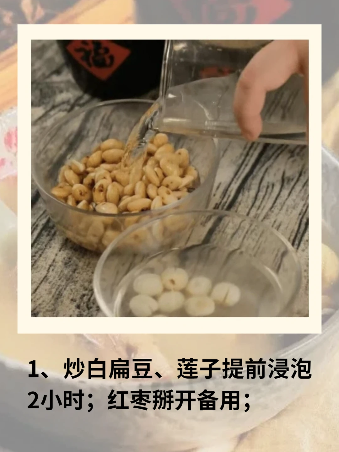 1、炒白扁豆、莲子提前浸泡2小时;红枣掰开备用;