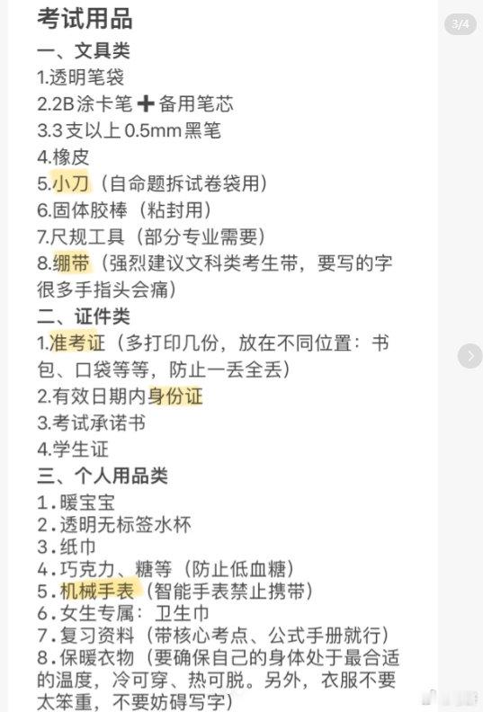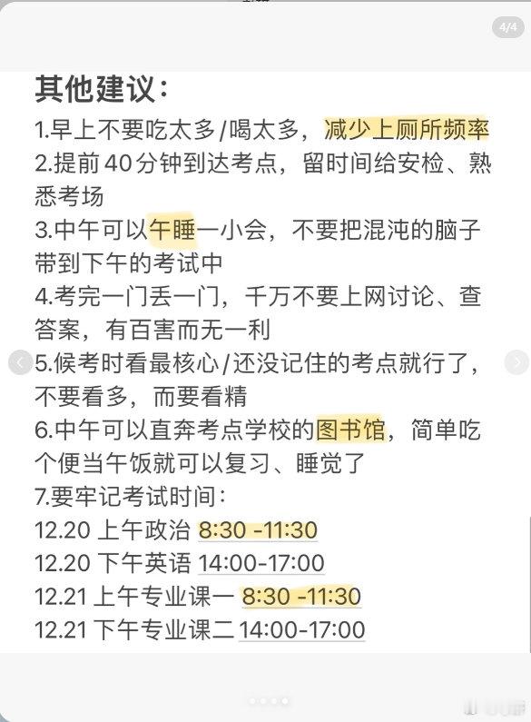 26考研前一天待办事项!12月19日 下午四点抵达考场附近酒店16:00-17:00 踩点➕买晚饭、明日早午饭➕准备考试用品18:00-19:00复习英语19:00往后的时间:复习政治 (肖四主观题、肖四肖八所有选择题)22:00准备睡觉考试用品一、文具类1.透明笔袋2.2B涂卡笔➕备用笔芯3.3支以上0.5mm黑笔4.橡皮5.小刀(自命题拆试卷袋用)6.固体胶棒(粘封用)7.尺规工具(部分专业需要)8.绷带(强烈建议文科类考生带,要写的字很多手指头会痛)二、证件类1.准考证(多打印几份,放在不同位置:书包、口袋等等,防止一丢全丢)2.有效日期内身份证3.考试承诺书4.学生证三、个人用品类1.暖宝宝2.透明无标签水杯3.纸巾4.巧克力、糖等(防止低血糖)5.机械手表(智能手表禁止携带)6.女生专属:卫生巾7.复习资料(带核心考点、公式手册就行)8.保暖衣物(要确保自己的身体处于最合适的温度,冷可穿、热可脱。另外,衣服不要太笨重,不要妨碍写字)决战考研 2026考研 颉斌斌官宣