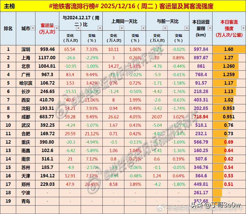 新线路开通首日,成都地铁客流量昨日683万人次以上[呲牙][呲牙][呲牙] 爆料 身边事 排行榜 周二 成都地铁 2025年12月16日 星期② 全国重点城市轨道交通客流量排行榜: 上海:1137.00万 北京:1084.81万 广州:967.30万广州地铁 深圳:959.46万深圳地铁 成都:683.77万 西安:410.70万西安身边事 武汉:392.25万武汉地铁 重庆:390.80万重庆爆料 南京:316.10万南京身边事 长沙:246.65万 郑州:229.03万郑州地铁 天津:194.12万天津爆料 沈阳:193.31万沈阳身边事 苏州:185.70万 合肥:169.72万合肥地铁 青岛:100万+青岛地铁 宁波:100万+ 哈尔滨106.72万哈尔滨爆料 南昌:102.60万
