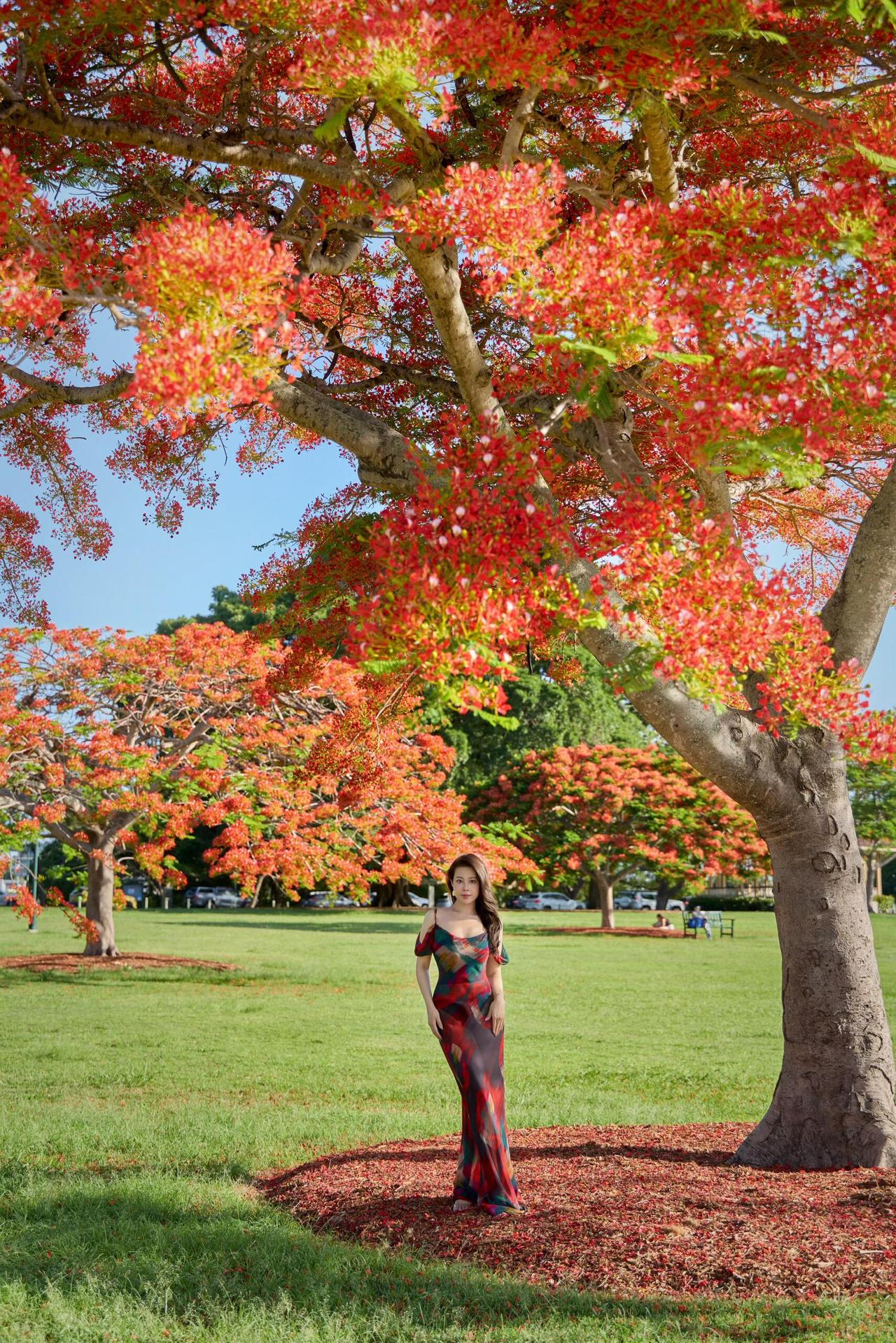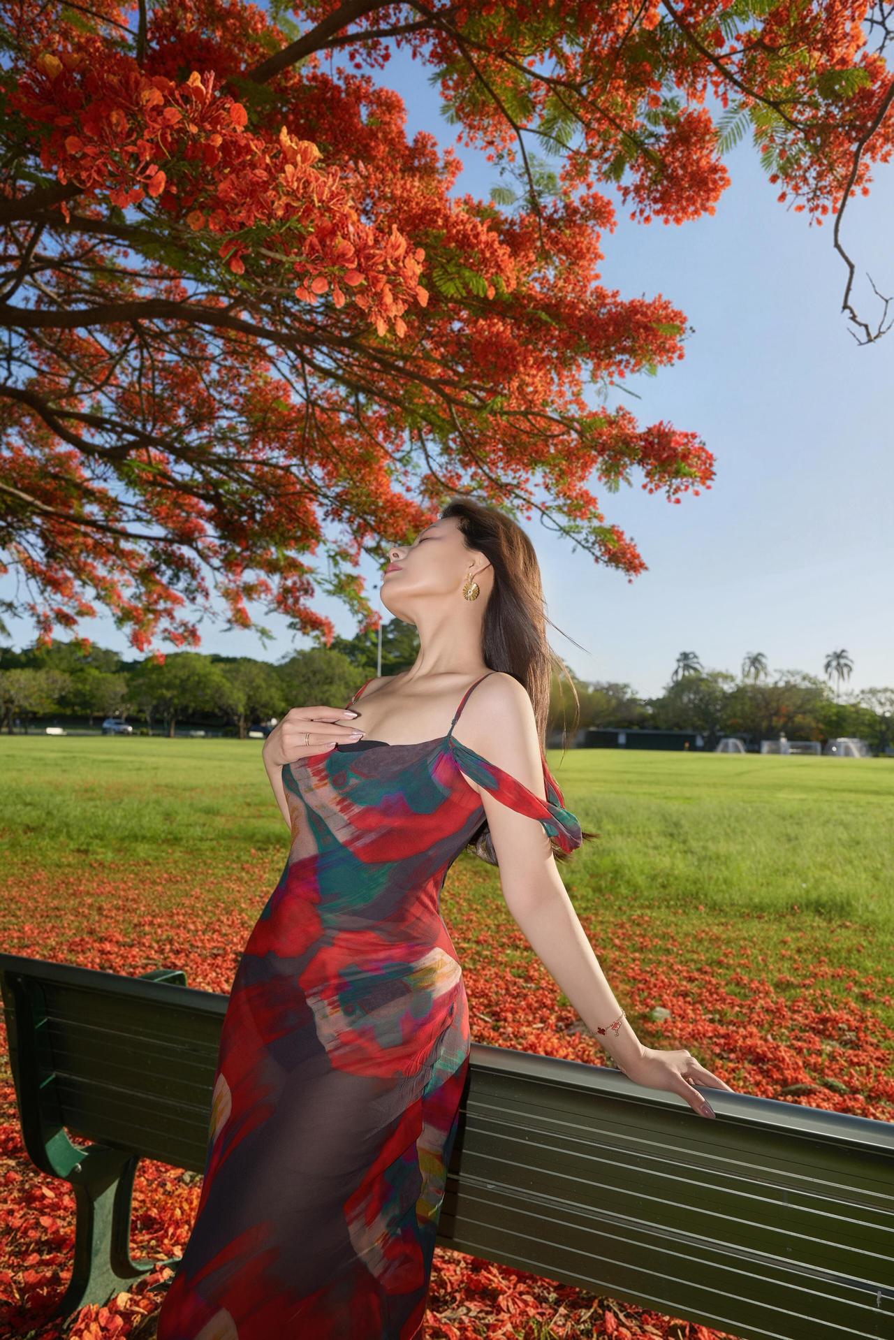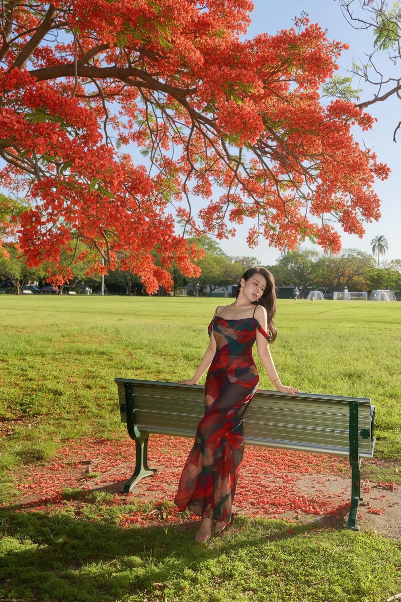 凤凰花开 晒图笔记大赛 (点击图片查看原图) 美丽的凤凰花,开得不管不顾,一树的红,泼泼洒洒地漫出来,把整个夏天都染得热烈。 她站在花树下,长裙与花影重叠,像是把整树的花都穿在了身上。侧身回望时,眼波里映着花影,耳饰随着微风轻晃,似在应和花枝的摇曳。 夏风掠过时,空气的清冽混着花香漫上来,不浓不淡,恰如这午后的日光,把人浸在刚好的温柔里。 正是: 凤凰树下绛云浮,罗衣香散露华柔。 六神清气融夏意,半入花魂半入眸。