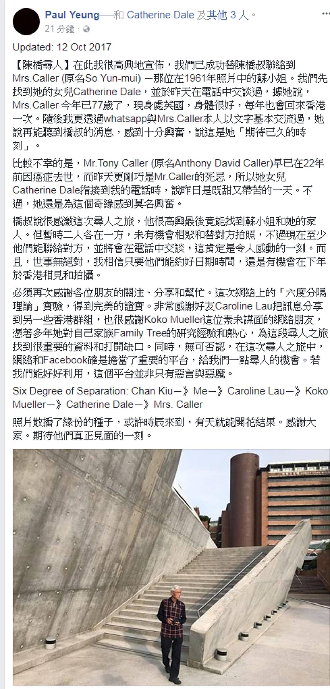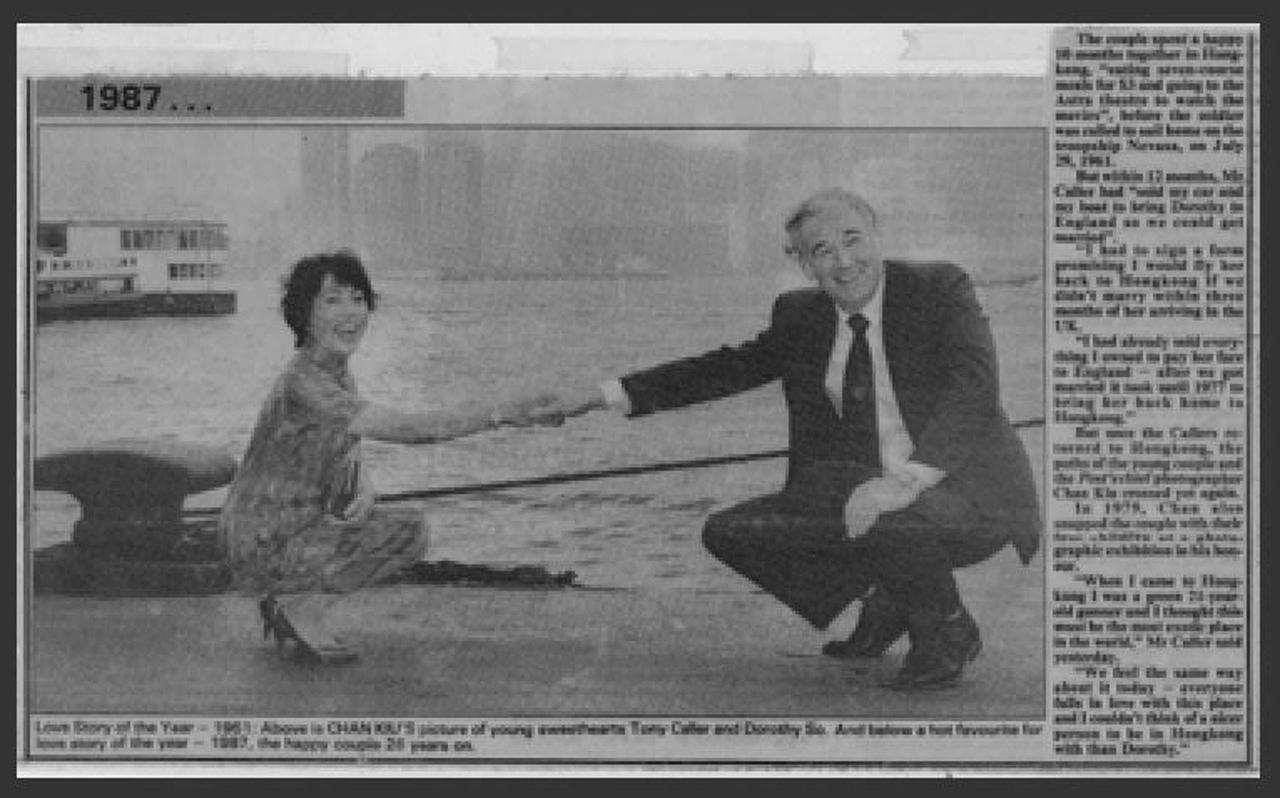 1961年,香港码头,英兵Tony Caller与好友苏小姐的离别一刻,被摄影师陈桥拍下。 照片成为经典,在当时媒体转发。 图中的两人后来在英国结婚,并在1975年定居香港,两人育有4名子女。 1979年,两人得知自己成为经典新闻照的主角,便全家到新闻摄影展欣赏照片,再次与陈桥相遇。 1987年,Caller夫妇结婚25周年,他们致电桥陈桥,希望对方能为他们再拍一次那张经典照,两人更说希望25年后、即结婚50年的金婚纪念日再拍一张。 惟25年后即2012年,Caller夫妇并没有联络陈桥,不过陈桥仍念念不忘,于是托摄影师杨德铭网上寻人。 最后得知,苏小姐的丈夫Tony Caller早在22年前因癌症去世,她的女儿表示,可以再听到陈桥的消息感到十分兴奋,坦言这是“期待已久的时刻”。