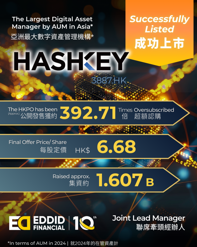 HASHKEYHLDGS本次全球发行2.41亿股新股,集资总额约16.07亿港元。艾德金融担任本项目的联席牵头经办人,助力HASHKEYHLDGS登陆国际资本市场,成为「香港加密资产第一股」。