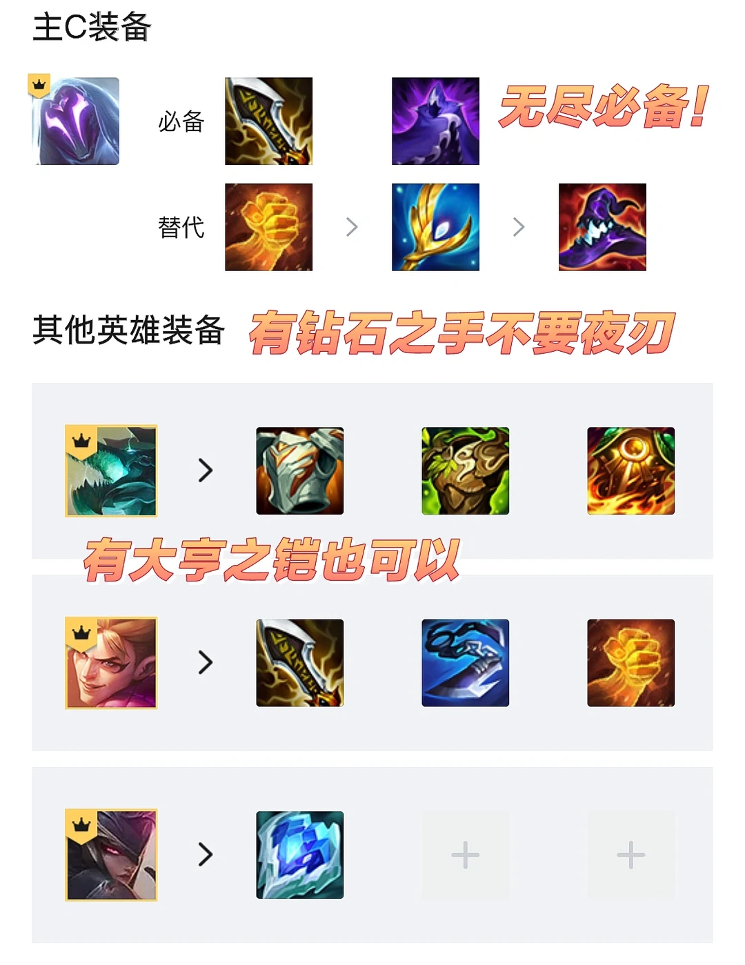 派克核心是无尽,然后最优是搭配钻石之手(投资器死7次)然后加个续航或者法爆,没有钻石最优就是夜刃(派克容易被AOE打死假赛),派克来之前先给皎月打工。