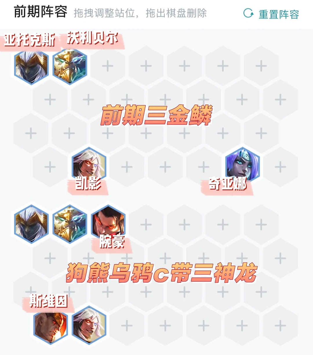 前期三金鳞看情况搭配神龙尊者/斗士/刺客/怒翼龙棋子都行,主要是看金鳞龙的装备,每把可以上下一个金鳞龙棋子,后手给装备,针对性给收益更稳定。