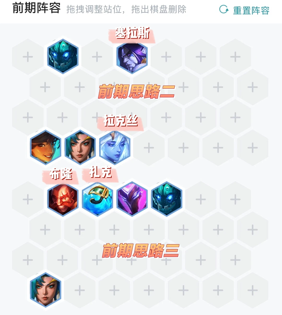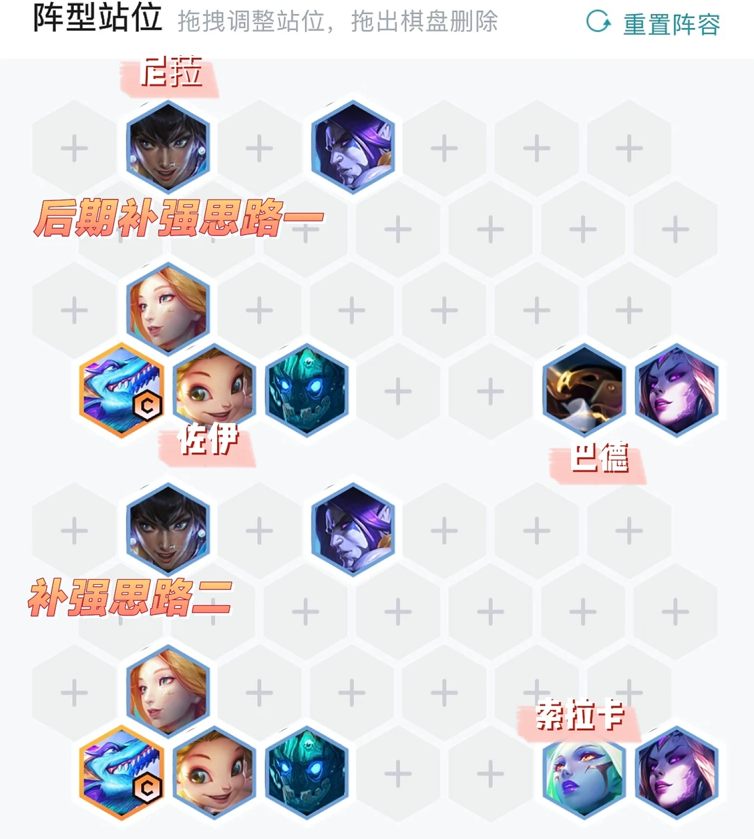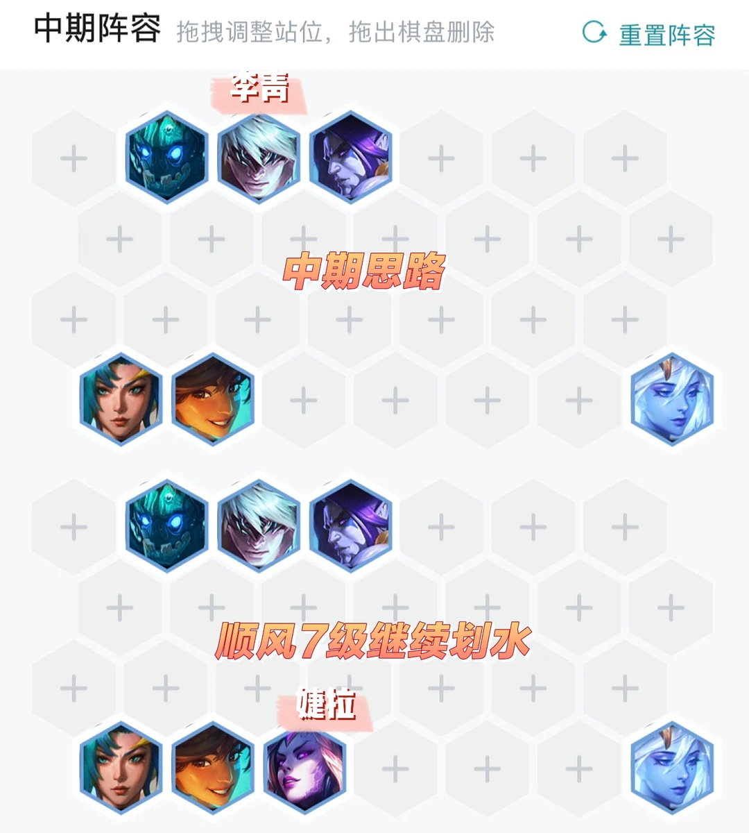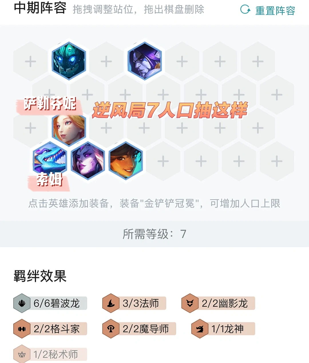中期如果比较逆风,需要在7人口抽出二星塞拉斯和一星索姆锁血然后上8,正常直接过度到8级搜牌。