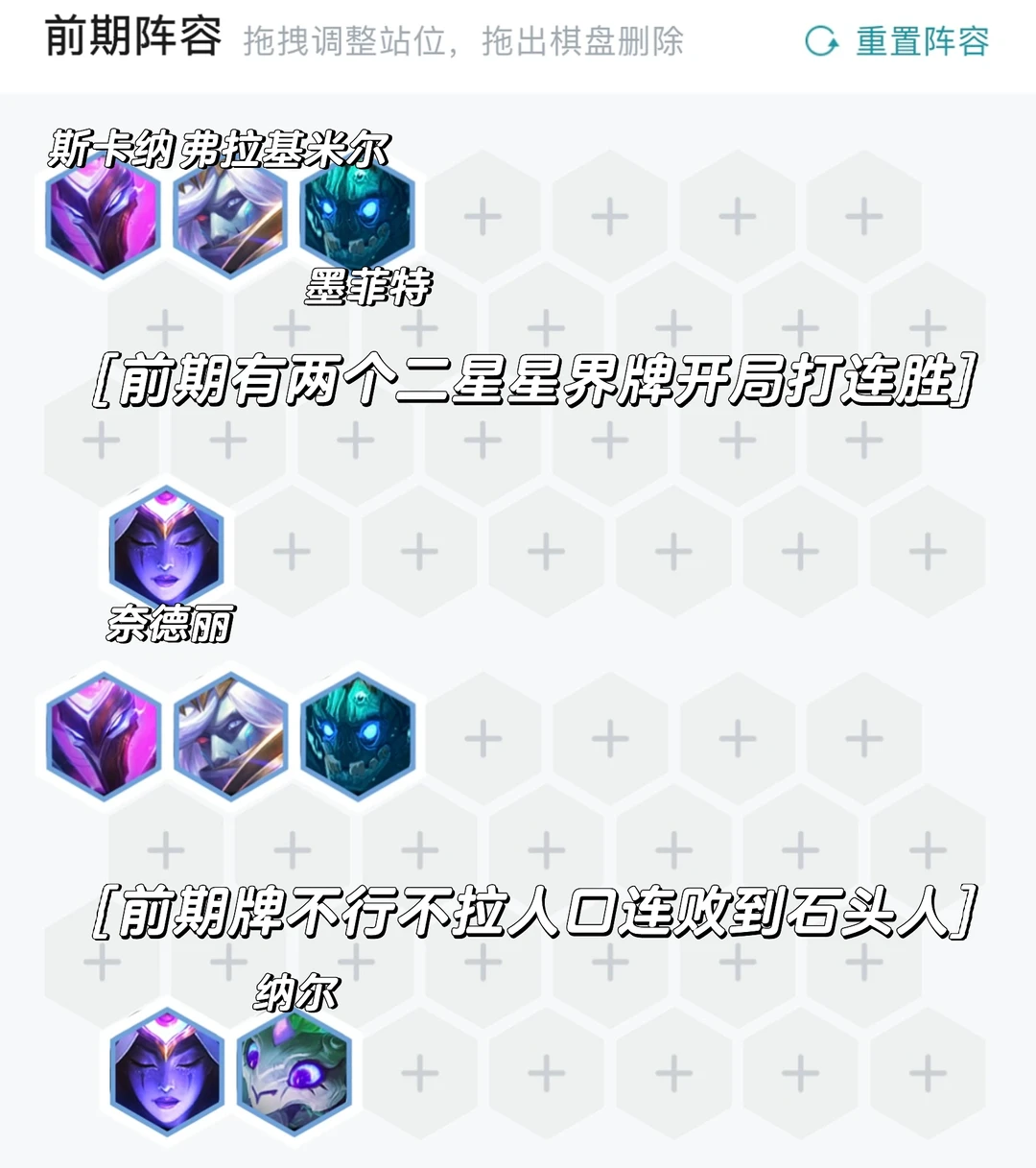 前期可以连败,也可以连胜。判断基础是星界牌的质量,如果有两个二星怪则可以拉人口打连胜,如果牌比较差最好是不拉人口连败到石头人吃利息最佳。