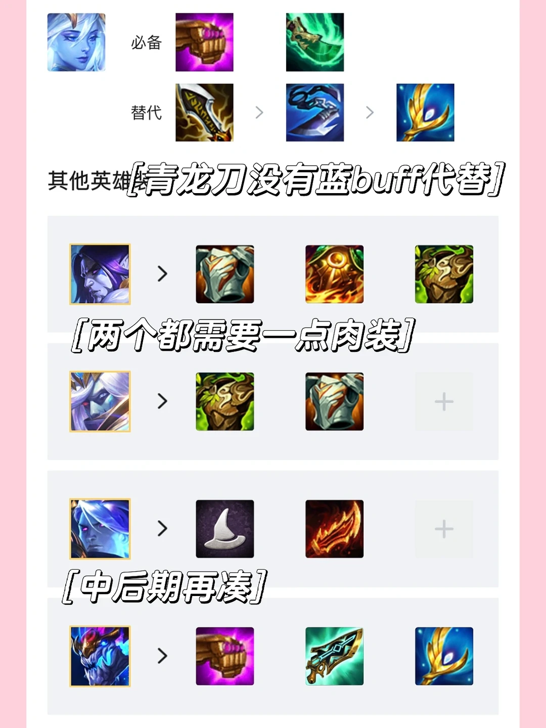 装备思路:拉克丝是60点蓝,其实青龙刀和蓝BUFF在实战效果差不了太多,一个开局启动,一个多20法强。吸血鬼和塞拉斯最好都要有肉装,要不扛不住,韦鲁斯最好就是法转加羊刀控制而且能补点输出。
