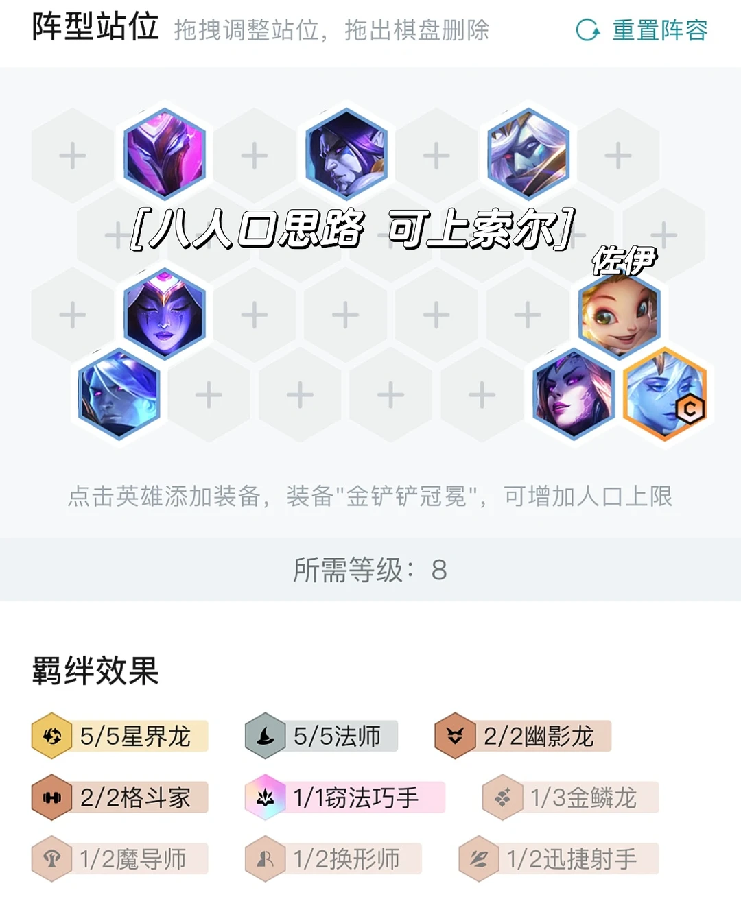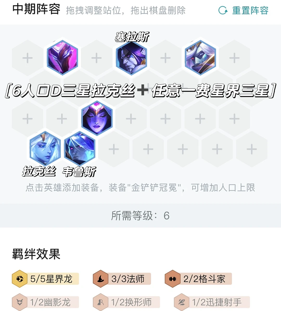 5人口尽量找出一张三星一费星界卡,6人口找出拉克丝三星+任意一个星界一费三星这样就可以连胜上7上8了。
