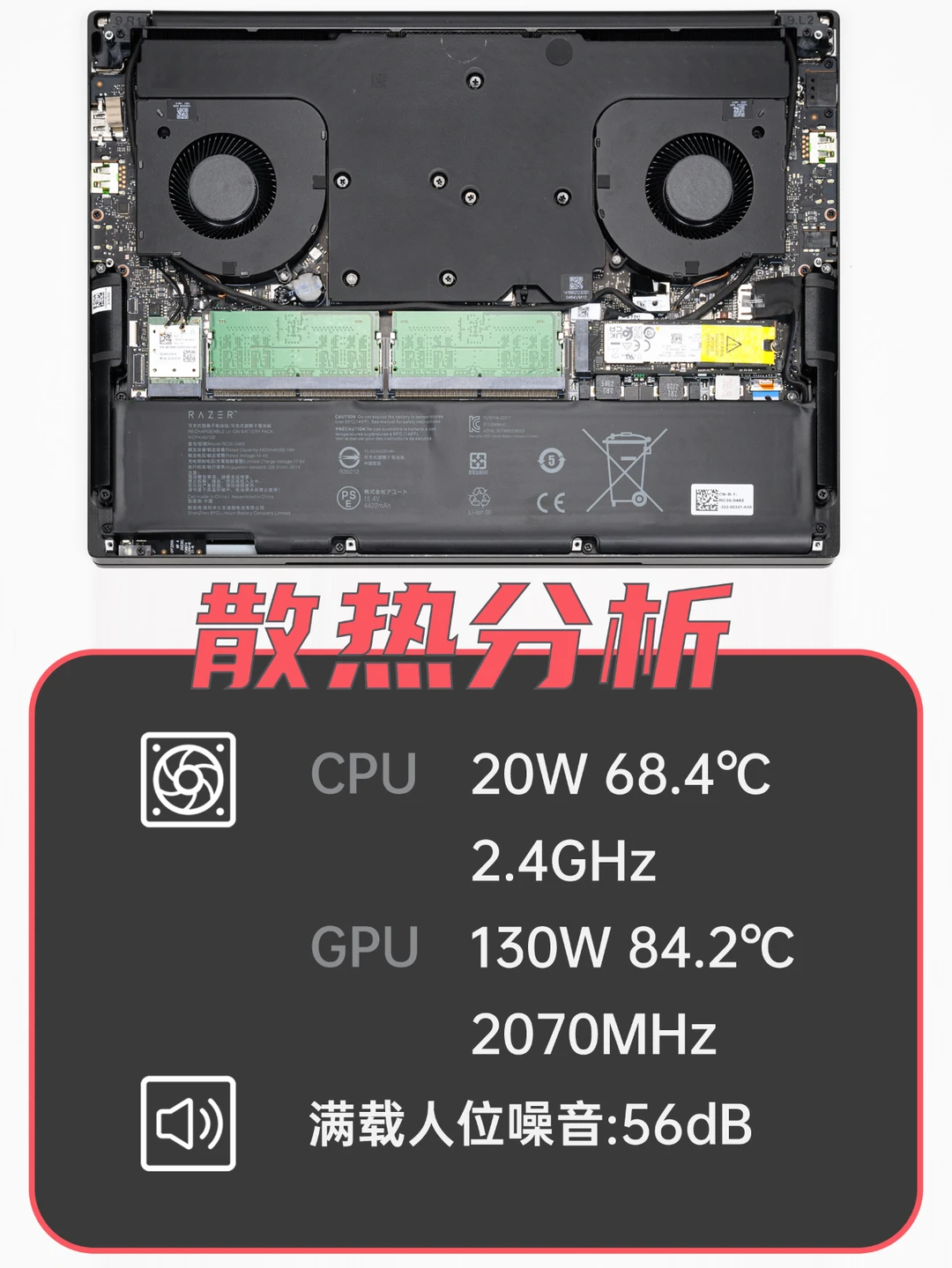 为了压制高规格硬件,雷蛇采用了均热版+双风扇散热,满载时能有40+110W的整机功耗释放,足以让CPU和GPU都高效运行。