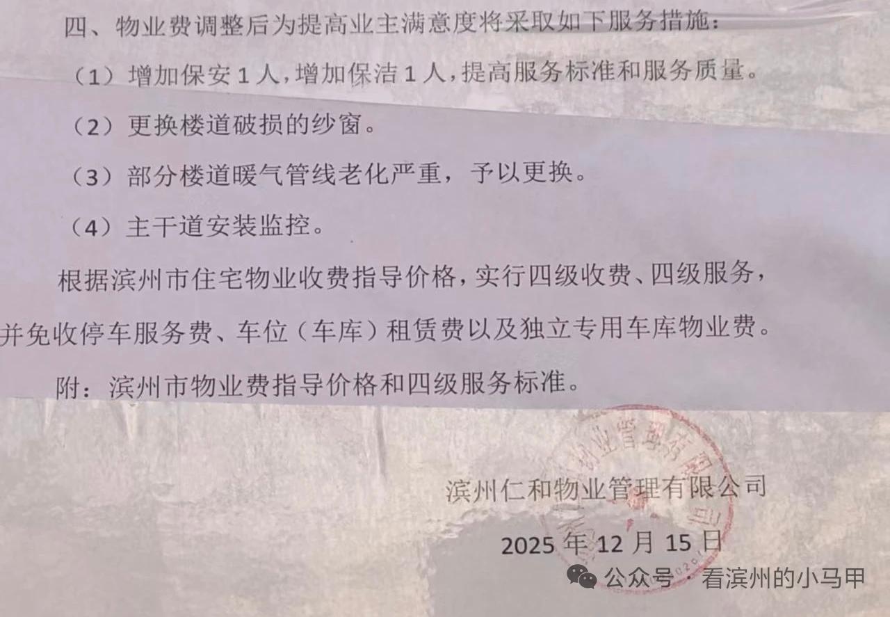 滨州一小区物业费调价 近日,山东滨州滨城区市东街道书香名居小区物业贴通知:因小区公共设施老化维修费增、员工工资低于周边小区积极性不足、教育部门不再拨付维修款,当前物业费入不敷出,征求部分业主意见后,2026年1月1日起调价。 该小区此前曾因雨污分流后道路破损未解决被曝光。 来源 看滨州