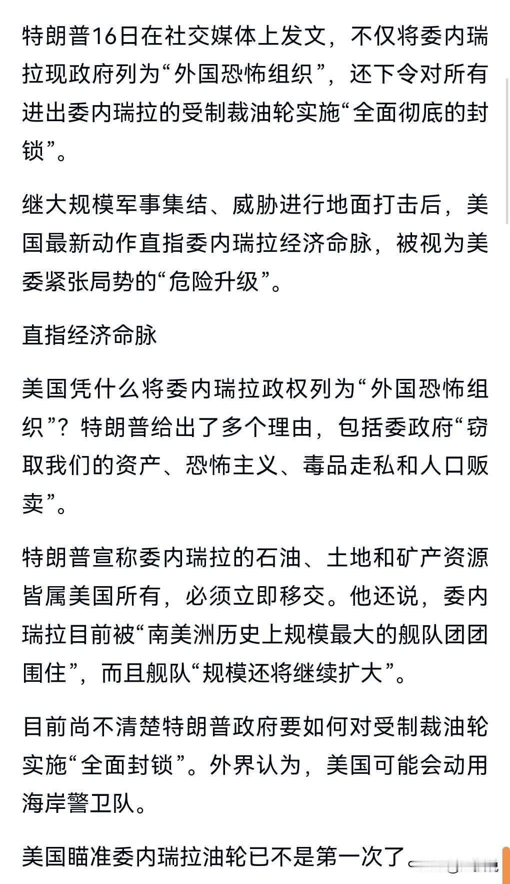 美国就是一个强盗国家,他们不接搞叙利亚的石油和小麦,现在又盯上了委内瑞拉。 特朗普丧心病狂的说委内瑞拉的石油、土地、矿产属于美国所有。 这真是让人感觉莫名其妙,就说出如此大言不惭的话。 特朗普要对委内瑞拉下狠手了,要实行经济封锁了。