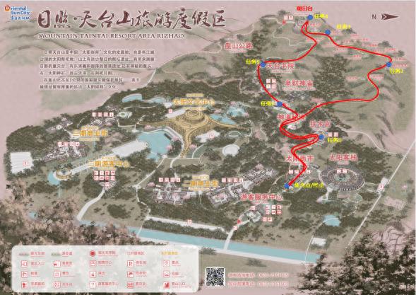 路线二:太阳街市(太阳圣钟)—财神庙—天台书院—观日台—太阳神石—羲和部落—扶木宫—太阳街市(太阳圣钟)