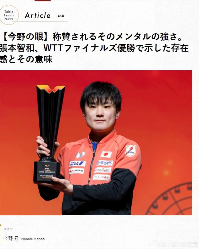 wtt年终总决赛25张本智和 《桌球王国》杂志网站发表文章,《【今野视角】为人称道的超强心理素质 —— 张本智和凭 WTT 总决赛夺冠彰显的存在感及其深层意义|乒乓王国 PLUS》《第四次晋级决赛终夺 WTT 总决赛首冠 身为日本男乒领军人物,他再度彰显绝对存在感》一连串的精彩表现堪称令人心潮澎湃,其震撼全场的实力更是让全球乒乓球迷为之折服。在 WTT 系列赛收官之战 —— 香港 WTT 总决赛(12 月 14 日落幕)的赛场上,丰田汽车旗下选手张本智和斩获个人职业生涯的首个总决赛冠军。他在八分之一决赛击败法国选手 F・勒布伦,半决赛战胜中国选手林诗栋,决赛又力克巴黎奥运会银牌得主、瑞典选手莫雷高德,一路高歌猛进的夺冠征程,被各大媒体争相报道。本届赛事汇聚了凭借 WTT 系列赛积分跻身世界前十六的顶尖高手,张本智和赛前便抱着坚定的信念:“这是我第四次闯进决赛,所谓‘事不过四’,我必须拿下冠军,也只能拿下冠军。”近年来,日本男乒涌现出松岛辉空这样的新星,在他身后,还有曾夺得世乒赛男双冠军的户上隼辅、篠塚大登等实力干将。即便在人才济济的竞争环境下,张本智和依旧再度证明了自己的价值 —— 他不仅是日本男乒当之无愧的领军人物,更是当今世界乒坛最接近巅峰的选手之一。不过,张本智和此前登上网络媒体的热议榜单,却是因为 12 月初混合团体世界杯期间发生的一件事。12 月 5 日,日本队对阵韩国队的赛前入场仪式上,现场播报员起初并未念到 “张本智和” 的名字。此事一度被部分声音与日中政治局势关联,炒作称 “这是中方的故意刁难”。针对这一争议,当时正在当地考察的日本乒乓球协会副会长星野一郎,在不久前的理事会会后记者会上作出了如下说明:“确实出现了念错名字的情况,几秒钟后现场才补报了张本智和选手的名字。虽然张本选手当时面露不悦,但比赛刚一结束,赛事主办方就向张本智和与张本美和兄妹二人当面致歉,称‘非常抱歉’。”此外,对于张本智和在本届混合团体世界杯对阵法国队时遭遇现场观众嘘声一事,星野副会长补充道:“我们向赛事组委会提出了交涉,强调‘这样的环境会影响选手正常比赛’,并要求组委会持续协助解决这一问题。” 由此可见,入场时漏报姓名不过是主办方的工作失误,而张本智和身处客场作战,遭遇一定程度的嘘声,或许也在情理之中。很难认定这是中国球迷乃至相关高层针对张本智和的刻意针对。事实上,近来中国国内也在热议部分狂热球迷的不当行为。在巴黎奥运会的赛场上,甚至出现过中国选手内战时,现场观众对着不被自己看好的一方破口大骂的现象。竞技体育的赛场上,选手的实力越强,就越容易成为焦点;而像张本智和这样,比赛中习惯于将情绪完全展露出来的选手,自然更容易引发对手球迷的反感。即便身处这样的舆论环境,张本智和依旧能保持强大的心理素质,在赛场之上展现出超高水准的乒乓球技艺,这样的表现值得所有人的称赞。不为逆风与杂音所扰,用乒乓球证明自身价值,这场胜利含金量十足近年来,众多中国乒乓球选手与教练员远赴日本,扎根当地并投身于日本青少年乒乓球人才的培养工作。回顾日本乒乓球发展史,水谷隼、石川佳纯、福原爱等一众名将,都曾师从中国教练,接受过悉心指导。从这一角度而言,在乒乓球领域,中国既是日本亲切的邻邦,更是值得感恩的 “引路者”。而众人皆知的是,中国乒乓球队也曾为了在世界赛场上站稳脚跟,将荻村伊智朗、松崎君代等日本传奇选手视为学习的榜样。诚然,我们无法否认部分激进球迷的存在,但将张本智和遭遇的嘘声、赛事主办方的工作失误,刻意与政治局势捆绑解读,显然是不妥当的。张本智和的球风以凌厉的进攻著称,赛场上也时常流露情绪,但他同时也是一位极具体育精神的选手。无论比赛胜负,他都会在赛后真诚地称赞对手,这一谦逊的态度也赢得了众多海外选手的尊重。张本智和在香港收获的这座冠军奖杯,绝不仅仅是一个赛事头衔那么简单。这是一场不为逆风与杂音所扰,纯粹用乒乓球实力证明自我的胜利;更是日本乒乓球在与世界乒坛的长期交流、竞争中,书写下的又一浓墨重彩的一笔,具有非凡的历史价值。(机翻)图1:张本智和在 WTT 香港总决赛男单决赛中击败巴黎奥运会银牌得主莫雷高德,成功登顶图2:张本智和在混合团体世界杯决赛中登场,他是日本队中唯一从中国队手上拿下一局的选手(图片来源:国际乒联)图3:张本智和(后方)与莫雷高德在 WTT 总决赛决赛结束后相互致意,对彼此的精彩发挥给予肯定