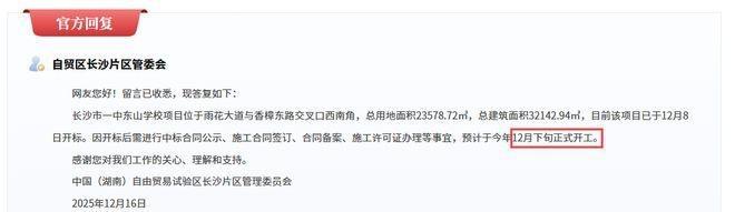 长沙有哪些口碑不错的小学值得推荐? ------------------------------------ 近日,有家长接连在问政湖南上提问,一中东山小学是否还会建设,并表示听说有消息传出将推迟到2026年5月建设。 关于具体的进度以及施工时间,官方给出了回复。 11月29日、12月15日,有家长接连提问,一中东山小学部是否按时开工,询问是否是资金出现问题。 官方回复: 目前官方已经回复称:该项目已经于12月8日开标,开标后还有一系列事宜需要处理,预计12月下旬正式开工,2027年建成开学。 学校介绍 长沙市一中东山学校是雨花区人民政府和长沙市第一中学联合创办的一所高定位、高标准、高质量的九年一贯制公办学校,是一中教育集团拔尖创新人才生源基地校。学校位于高铁新城片区核心板块,地处长沙市雨花区东山街道平阳南路与香樟路交汇处,小学部占地面积约30亩,初中部占地面积近60亩,2024年9月份已经开学。 招生情况 小学:适龄新生按照学区划分、生源排序安排入学。 初中:按照小升初配套入读政策执行。配套楼盘有观澜雅苑、和玺雅苑。 除这所小学外,2026年也将有一批新建小学建成开学。木棉小学(湘江新区)、长沙国体实验学校(雨花区)、中雅培粹未央学校(天心区)、青竹湖湘一外国语学校新校区(开福区)、雅礼会展学校(长沙县)。