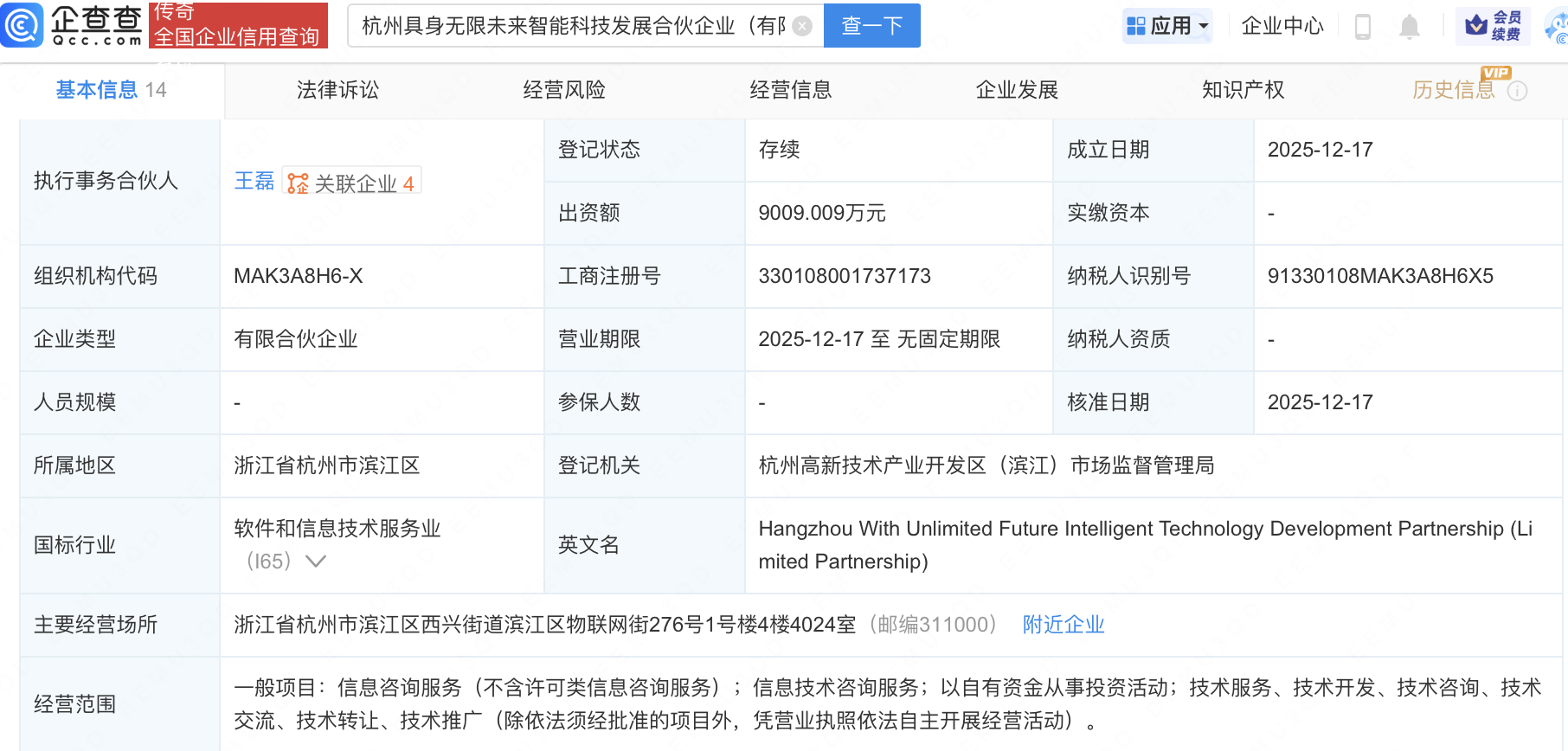 企查查APP显示,近日,杭州具身无限未来智能科技发展合伙企业(有限合伙)成立,经营范围包含:信息技术咨询服务;以自有资金从事投资活动等。企查查股权穿透显示,该企业由安恒信息(688023)、杭叉集团(603298)、北京银河通用机器人股份有限公司全资子公司杭州银河通用机器人有限公司等共同出资。