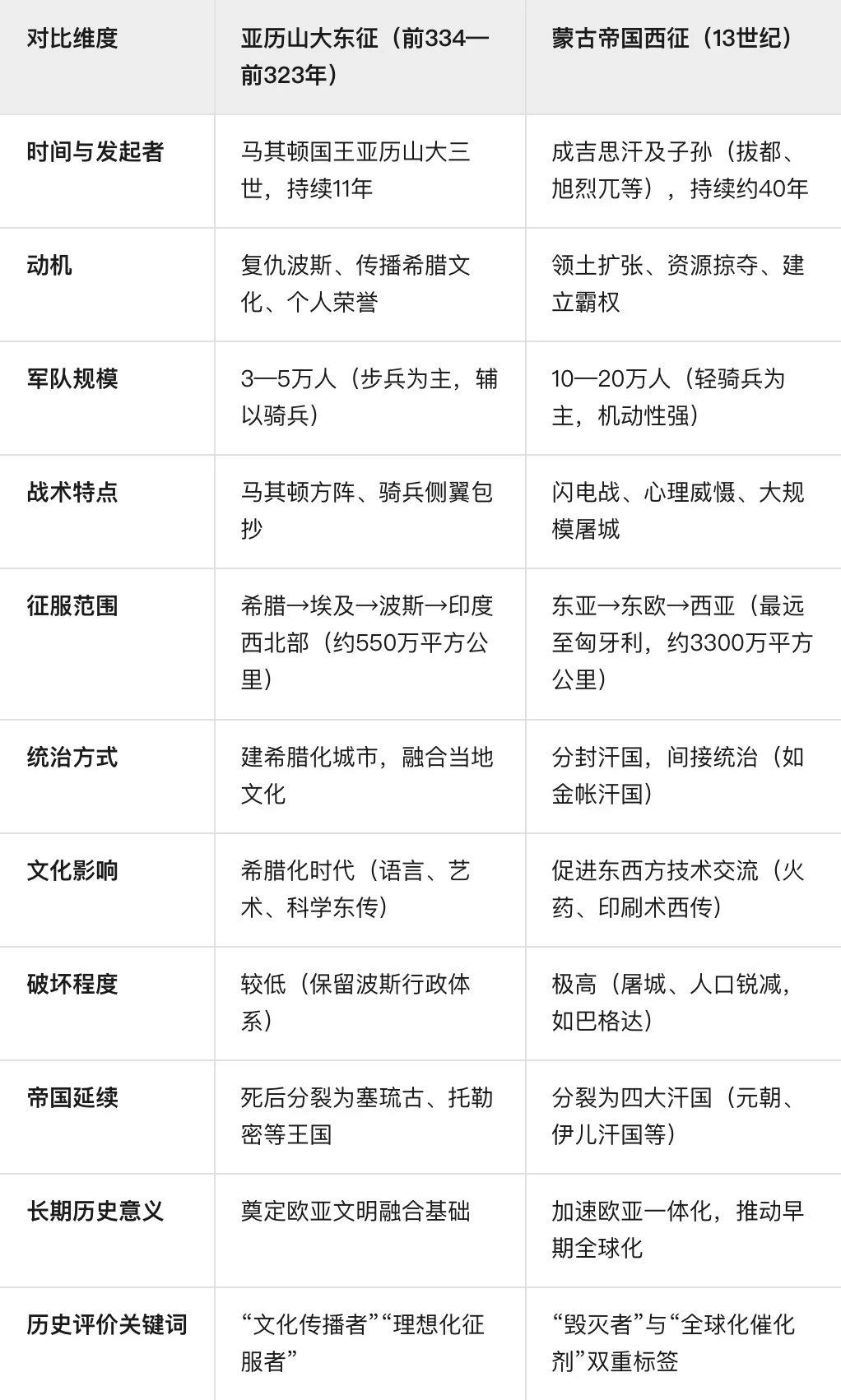 前者在客观上有利于文化的交融与发展,出现“希腊化时代”,希腊化时代的文化是希腊文化与西亚、北非等地的文化相互影响的产物;后者在客观上推动了东西方交流,引发了较大规模的民族迁徙,使亚欧内陆的民族分布产生了变化,一些被征服地区的文化面貌有所改变。