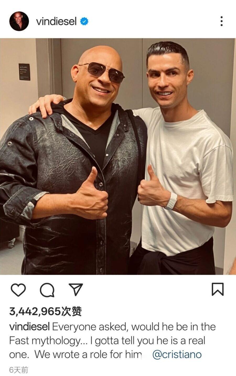 2025年末这波体育圈和娱乐圈的跨界联动太猛了!足坛巨星C罗要加盟《速度与激情11》,还是系列最终章。 “速激”主角范·迪塞尔亲自官宣,还说专门为C罗写了角色,这条动态两小时就有百万点赞,话题直接冲上多国热搜。12月18日,主演泰瑞斯·吉布森晒出剧组工作照,C罗正式进组。这可是他职业生涯首次拍剧情长片。《速度与激情11》2027年4月全球上映,前作《速度与激情10》在中国就拿下9.84亿票房,有了C罗,这最终章票房不得起飞?