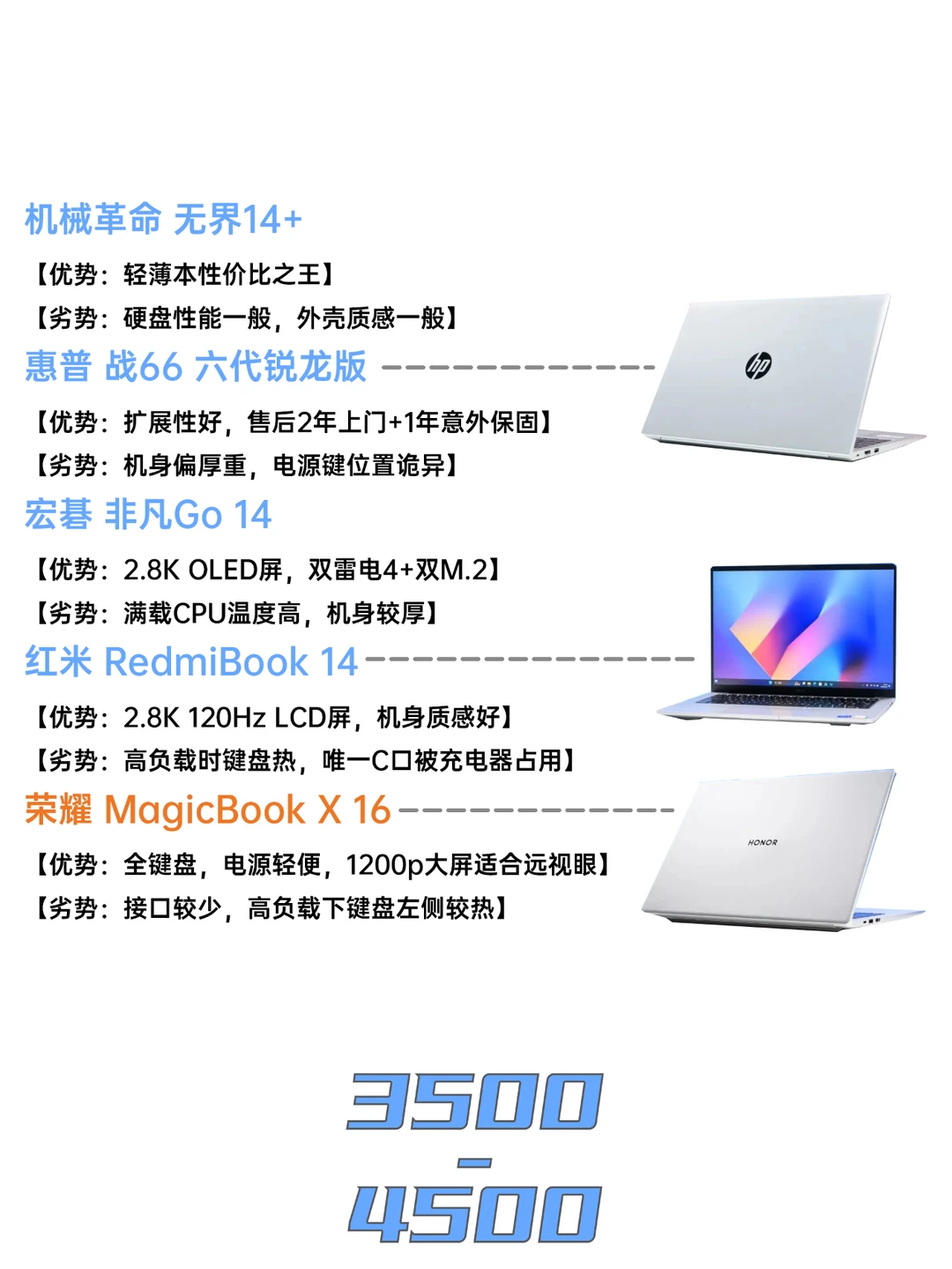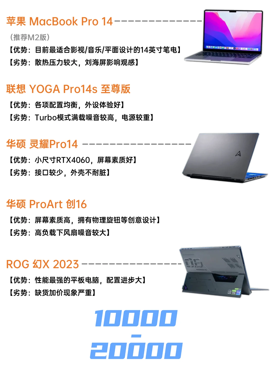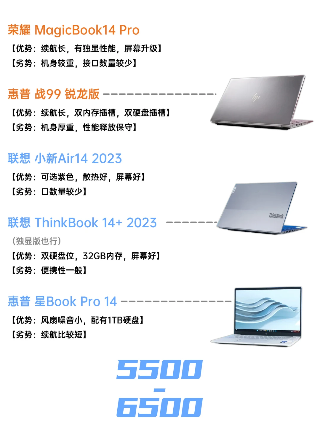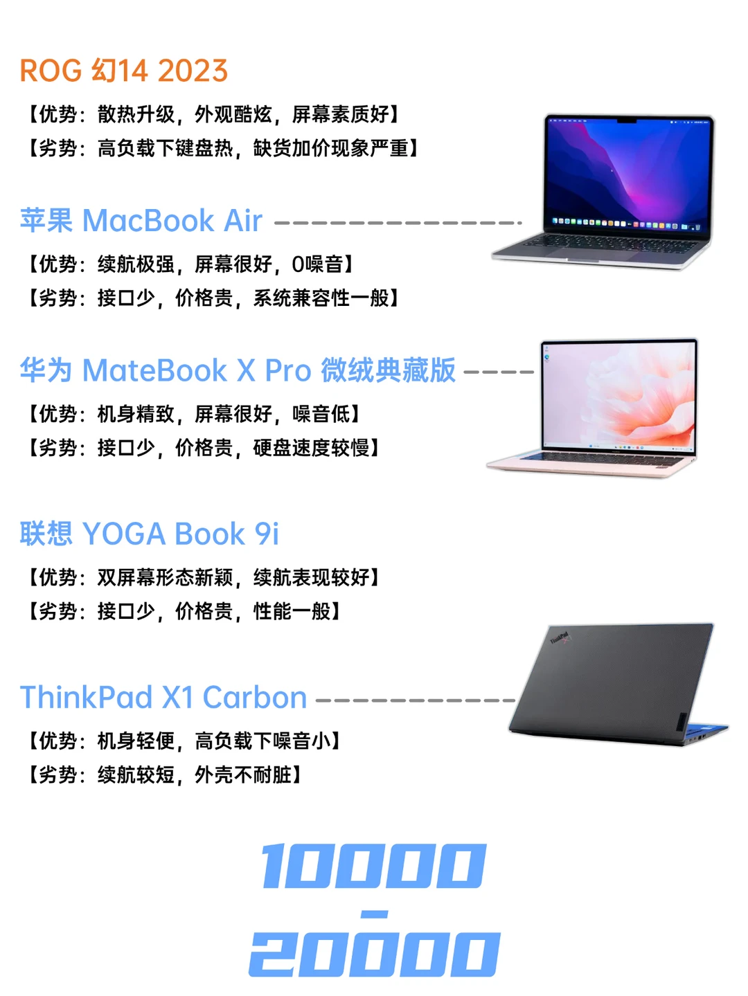 2,🟠黄色为💪万金油笔记本,既轻薄又有性能,但厚度重量不如超薄本,游戏性能也只能玩画质较低的游戏。高端万金油适合平面设计、影视剪辑人群使用。(个别定位复杂的笔记本,例如大屏幕核显本,也会被归纳在这里)