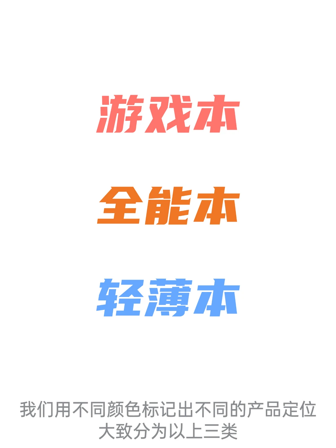 我们用不同颜色标记出不同的产品定位,大致分为三类:游戏本、全能本、超薄本。