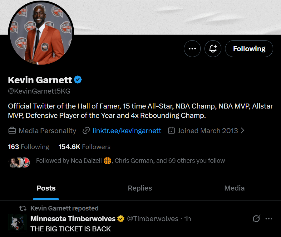 随后,加内特社媒也亲自转发了森林狼欢迎其回归的海报。