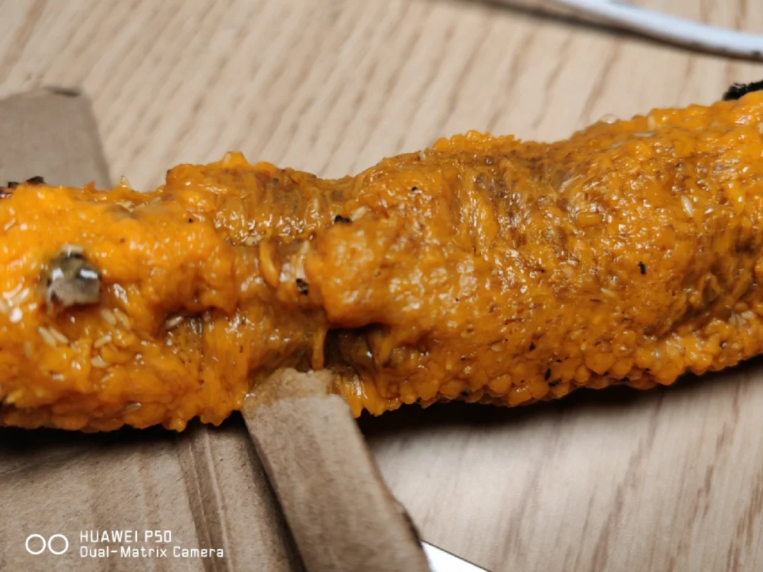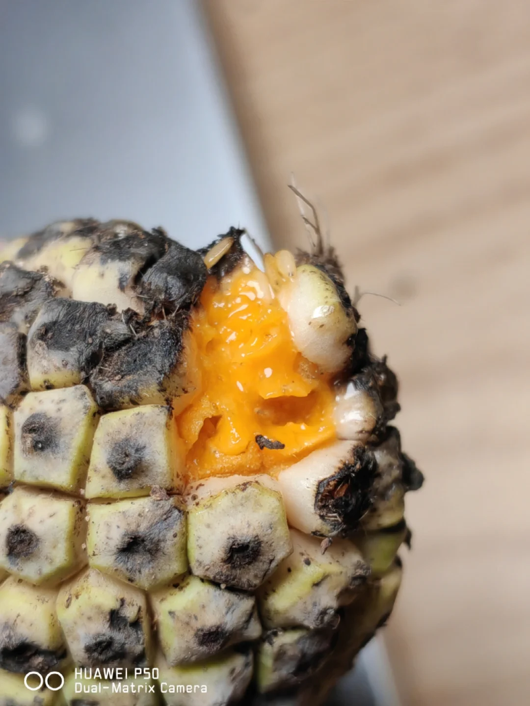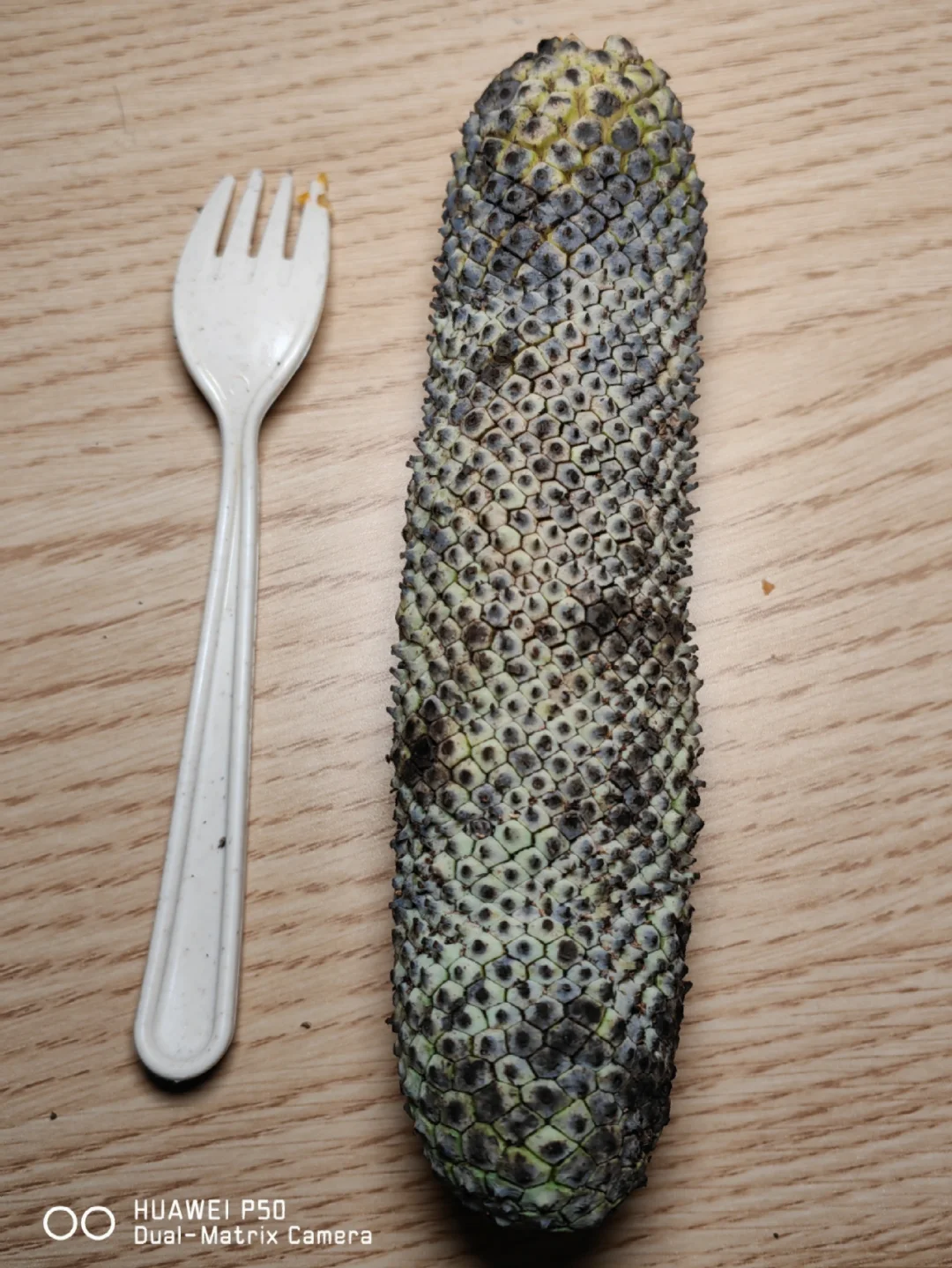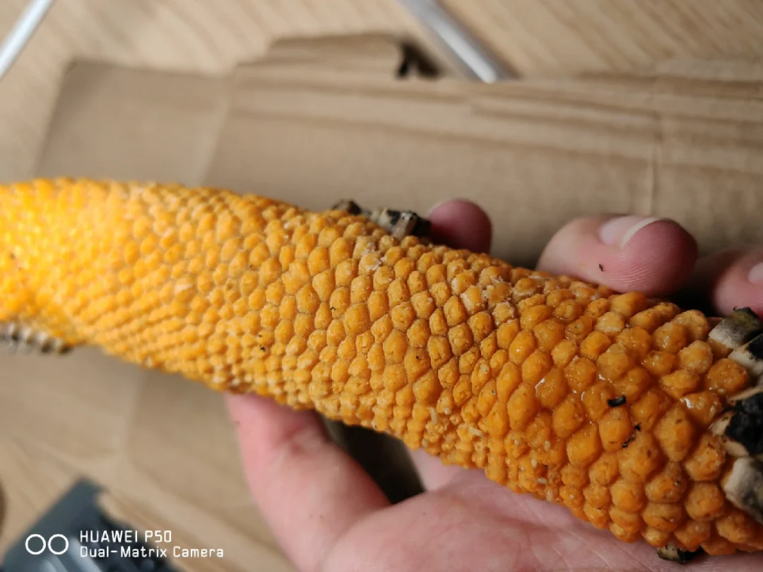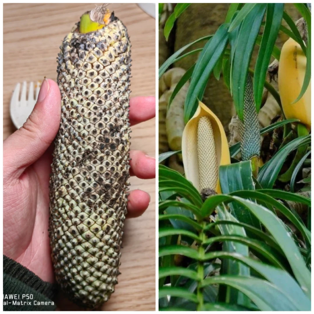 为了让它完全成熟,可以放在干燥透光的地方,让它再放几天,等到外面的小果实脱落下来(用手轻轻一碰就能脱落),就可以用小勺子小心地将果肉勺下来吃,和龟背竹果实一样,其里还有一条“果柱”,是无法食用的。经过三天的等待果实成熟了,散发着迷人的香味,很有热带风情,用手轻轻剥落外层的果壳,就露出其橙色的果肉,吃起来酸酸的,有点像橙子混合菠萝蜜和凤梨香蕉的味道[色色R],说不上来但是很是很奇妙,味道在一众平时吃的水果中绝不算差[哇R][哇R]