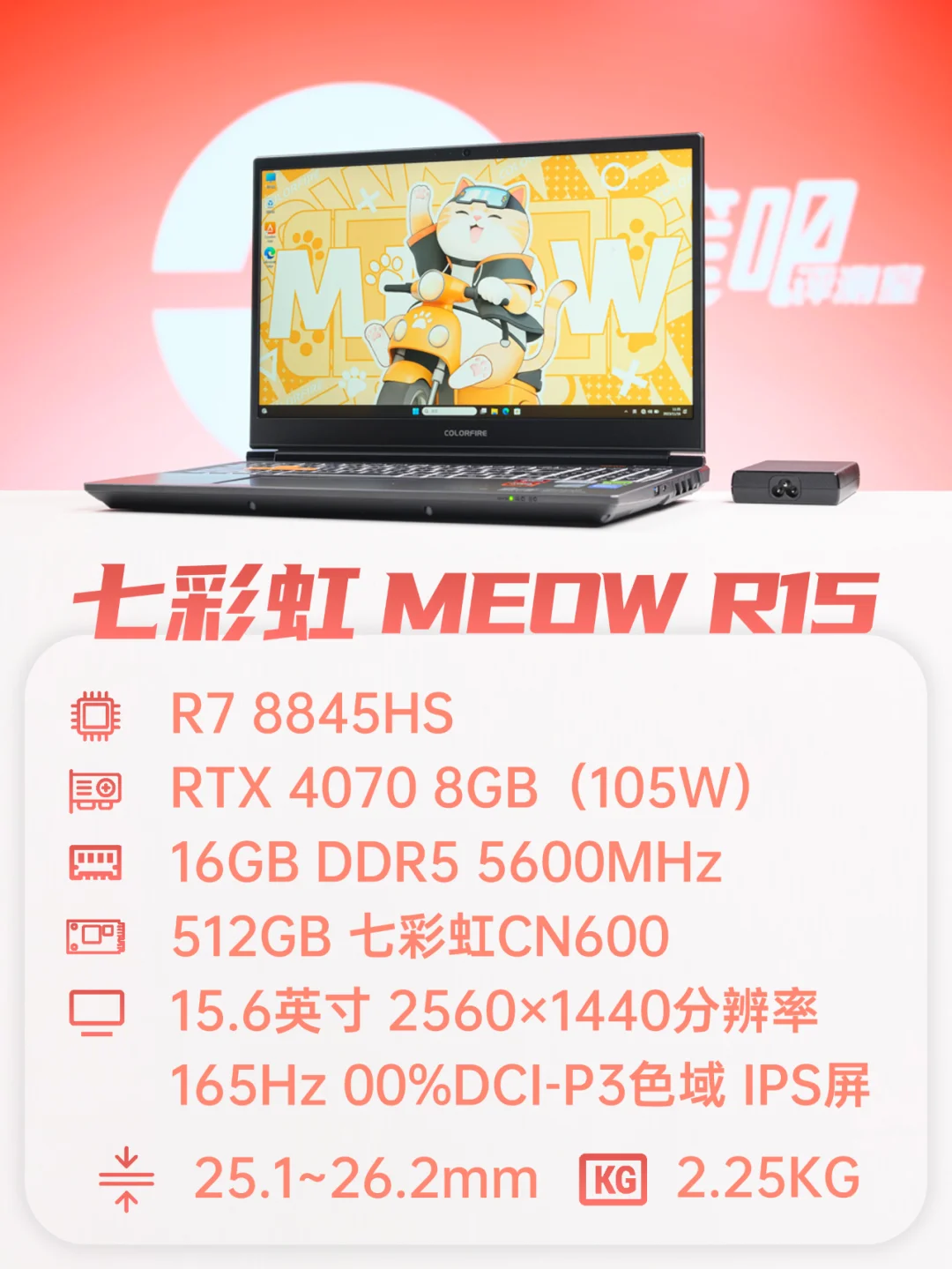 七彩虹COLORFIRE MEOW R15主打一个萌趣外观,机身充满了橘猫元素,甚至C面掌托还有猫掌印。它的配置选择丰富,低配还有R7+4050/4060版本,屏幕为1080P 144Hz高色域,售价分别是4️⃣9️⃣9️⃣9️⃣和5️⃣8️⃣9️⃣9️⃣。