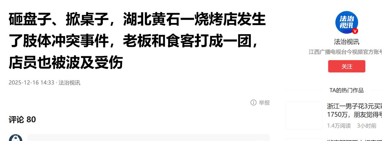 湖北黄石,6名男女吃了683元的烧烤,吃的时候没有提任何意见,临走前店主给他们抹零3元,可一男子非说送的菜品不新鲜,要求付650元,店主不同意,男子竟然挥拳就打,将店主夫妻俩、2名店员打伤。 这家烧烤店是叶女士和丈夫张先生开的,当晚来了一桌大客户,5 男 1 女点了不少烧烤还开了酒,全程吃得挺尽兴,觥筹交错间没谁对口味、菜品提过半个字的异议,叶女士为了招揽生意,还特意送了几份凉菜做人情,服务得周到又客气,本以为是笔顺顺利利的生意。 没想到结账的时候画风突然变了,同行的那位女士挺明事理,已经扫码准备付钱,总共消费 683 元,叶女士做生意讲究和气生财,主动说抹个零头,收 680 元就行,可就在这时候,桌上一名男子借着酒劲,非要把价格压到 650 元,还找了个牵强的理由,说叶女士送的第二盘凉菜不新鲜。 这话说得就有点不讲理了,要是菜真有问题,吃的时候怎么不吭声?当场提出来换一盘多简单,偏偏等吃饱喝足要结账了,拿免费送的赠品找茬,无非就是想少付 33 块钱,叶女士做的是小本买卖,送了菜本来利润就薄,再少收 33 块钱就得赔本,于是好言好语跟对方解释,说实在不能再少了。 可那男子根本不听,借着酒劲开始骂人越骂越难听,店主张先生听到外面的吵闹声,赶紧出来想劝和,还操着方言护着媳妇,没成想这一下彻底激怒了对方,那男子二话不说,一把掀翻了桌子,盘子碗碎了一地,接着冲上去就给了张先生一记老拳。 更过分的是他身后的另外 4 名男同伴像是收到了信号,不管三七二十一,跟着一起动手,把这变成了以多欺少的混战,五个大老爷们围着张先生打,叶女士和两名店员见状赶紧上前拉架,结果也没能幸免,都被对方拳脚相加,一个个被打得鼻青脸肿,好好的烧烤店,瞬间桌倒盘碎,一片狼藉,生意也彻底做不下去了。 这帮人在店里耍横的时候挺威风,可警车一响立马就没了底气,警方接到报警后很快赶到,当天晚上就抓获了 3 个带头闹事的,到了派出所里,这几个人异口同声说 “喝多了”,好像酒精能成为他们打人砸店的挡箭牌。可法律哪会认这种借口? 喝醉是自己选的,失去控制也得自己负责,就像司机不能说喝了酒就能随便撞车一样,醉酒绝对不是法外之地,警方先把这三个人约束到酒醒,再做进一步处理。 所谓的 “酒肉朋友” 关键时刻根本靠不住,剩下两名跑掉的同伙,第二天上午估计是心里发虚,怕事情闹大,主动去派出所投案自首了,但自首也不能抵消他们打人砸店的过错,只不过依法可以从轻处理。 第二天晚上 10 点处罚结果就出来了,那 3 个先被抓到的,因为情节更严重,被行政拘留 15 天,后来投案的两个也被拘留 10 天。这顿烧烤吃得可真够 “贵” 的,为了省 33 块钱,最后把自己送进了拘留所。 而且这事儿还没完拘留只是开始,他们还得承担经济赔偿,叶女士店里被砸坏的桌椅、破碎的餐具,还有因为店面被砸无法营业造成的损失,都得这五个人照价赔偿,更别说医药费了,张先生夫妻俩和两名受伤的店员,去医院检查、治疗的费用,还有误工损失,每一笔都得让这帮打人者掏腰包。 本来是一顿开开心心的烧烤,平摊下来每个人也就一百多块钱,结果因为一个人想耍威风、贪小便宜,硬生生把小事闹大,不仅自己要蹲拘留,还得大出血赔钱。 酒精或许能麻痹神经,但麻痹不了法律的底线,拳头或许能砸碎桌椅,但砸不破规则的约束。这顿 “天价烧烤”,算是给他们好好上了一课,也提醒大家遇事别冲动,尤其是喝了酒,更得管住自己的脾气,不然最后只能是得不偿失。