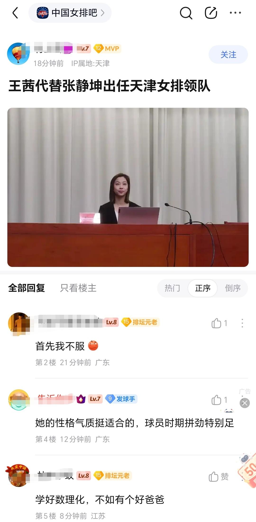 最近天津女排的人事变动挺大。原本的领队张静坤被换了,现在由王茜接替。这事在球迷群里炸了锅,网上讨论特别多。 老球迷说王茜当运动员时拼劲足,性格适合管队伍。但也有人酸溜溜吐槽她"有个好爸爸"。还有人把以前她说过"首先我不服"的采访翻出来议论。 王茜以前是天津女排国手,现在正式进管理层了。这事让人觉得体育圈的领导岗位选拔还是挺复杂的,可能有资历也有关系。 大家都在等看新领队带队后成绩会咋样。这事就这么着了。