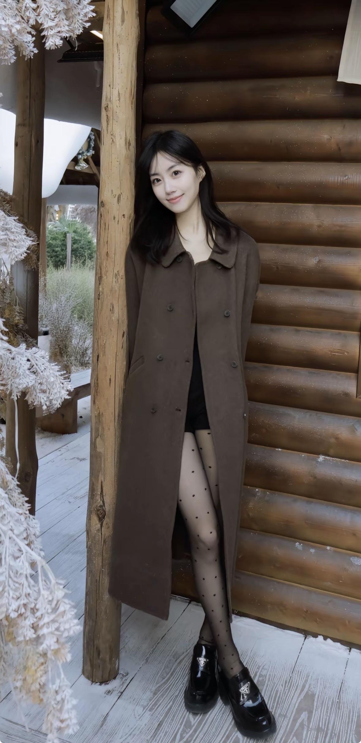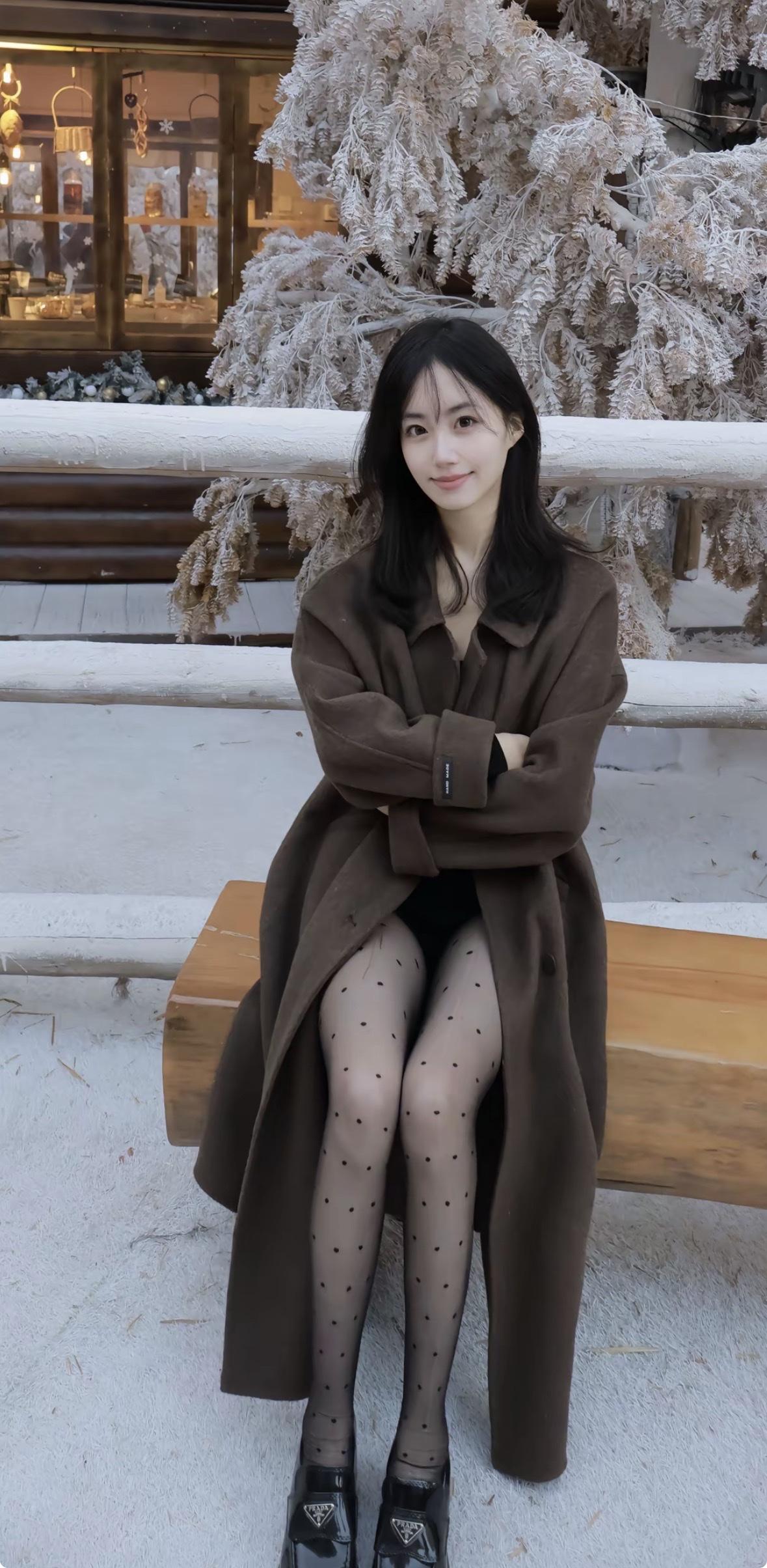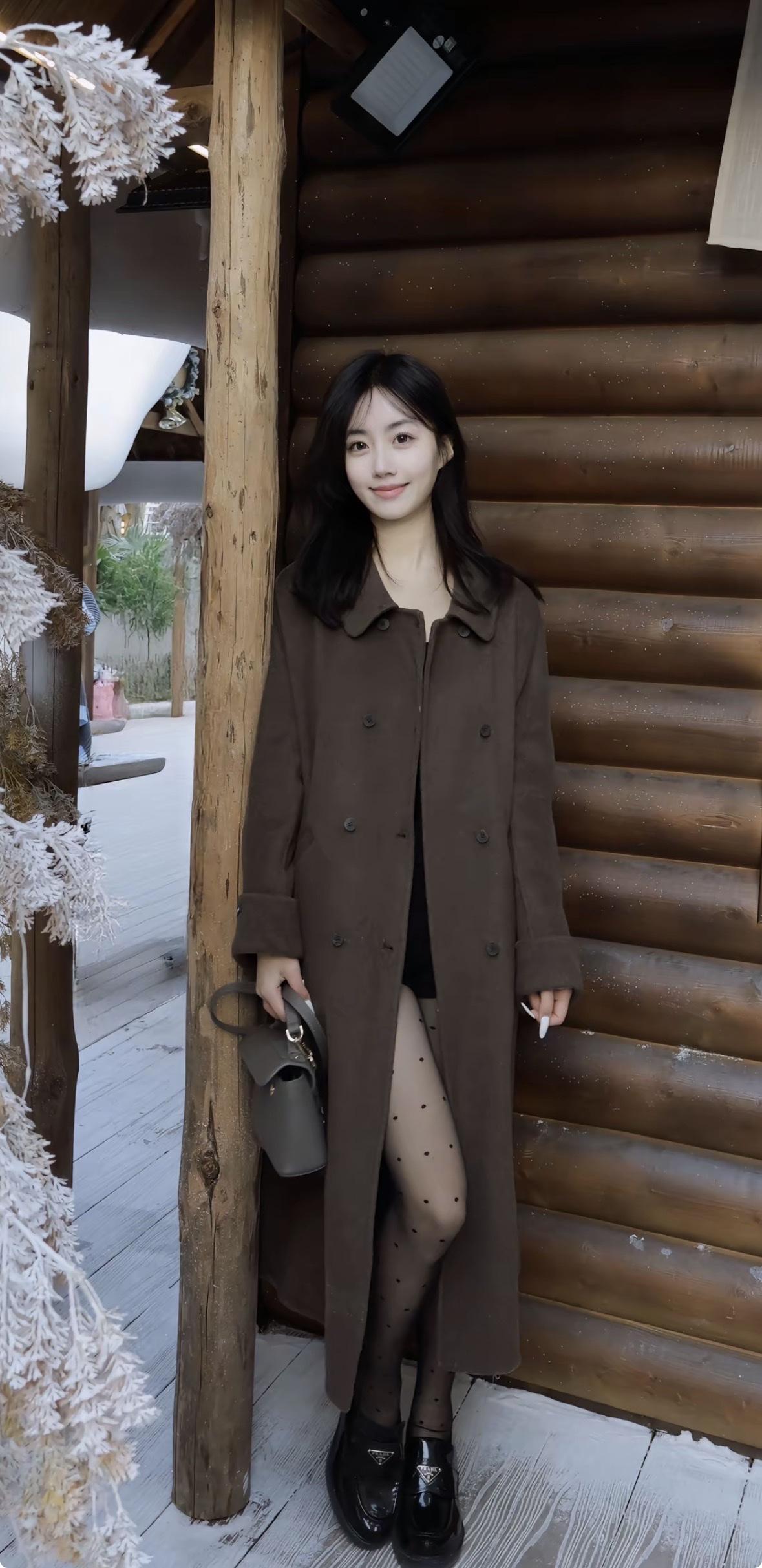 冬日暖阳下,优雅黑裙与棕色大衣的完美搭配,尽显温柔与时尚。