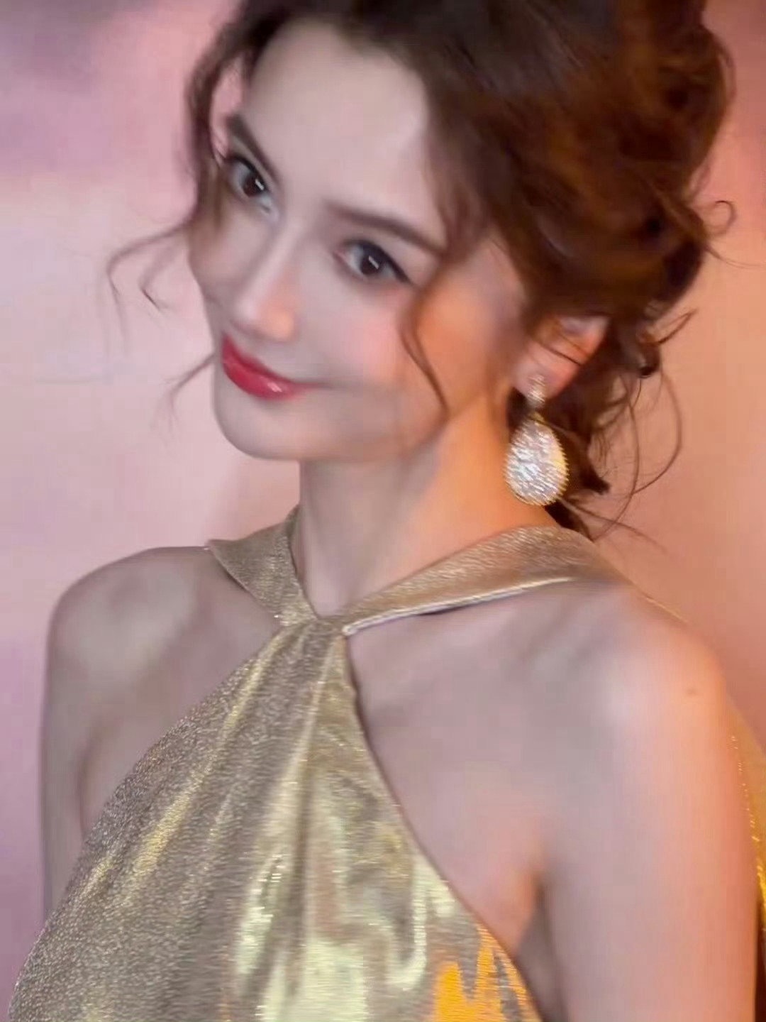 Angelababy|芭莎艺术之夜造型出图,身穿Alexis Mabille 2024秋冬系列高定金粉长裙,佩戴Boucheron高级珠宝,今天更是妈妈级别