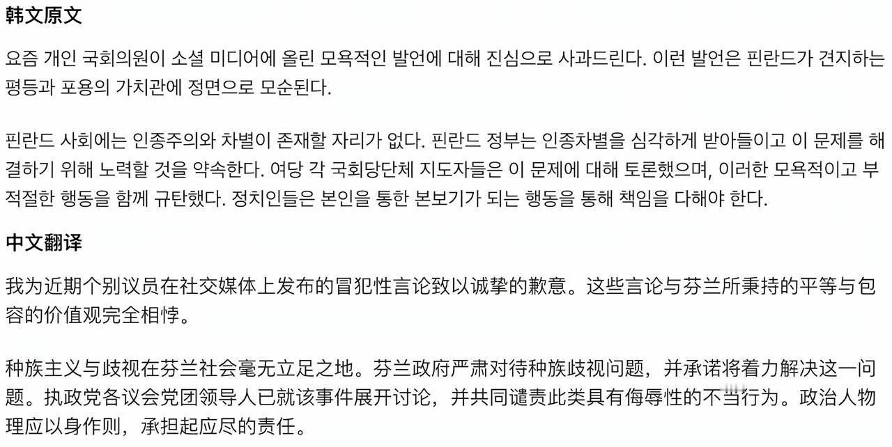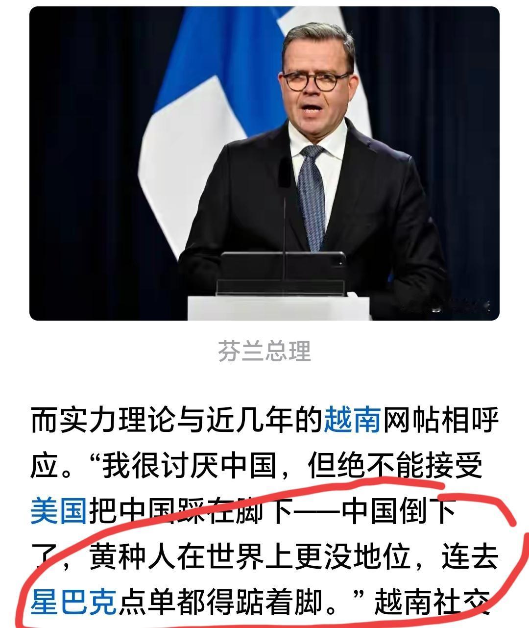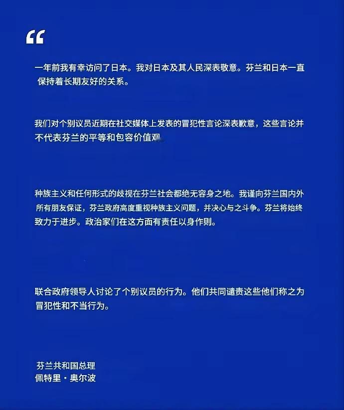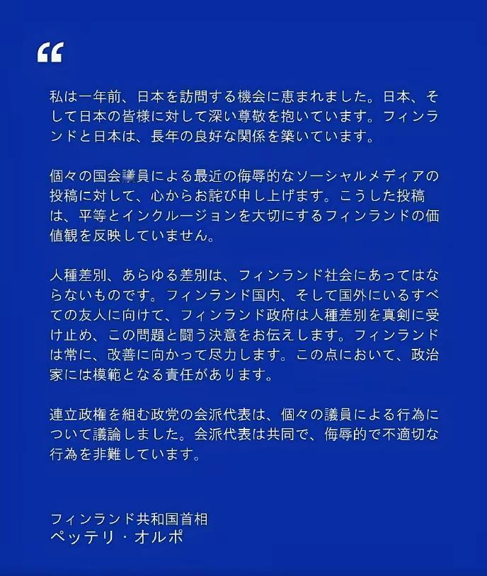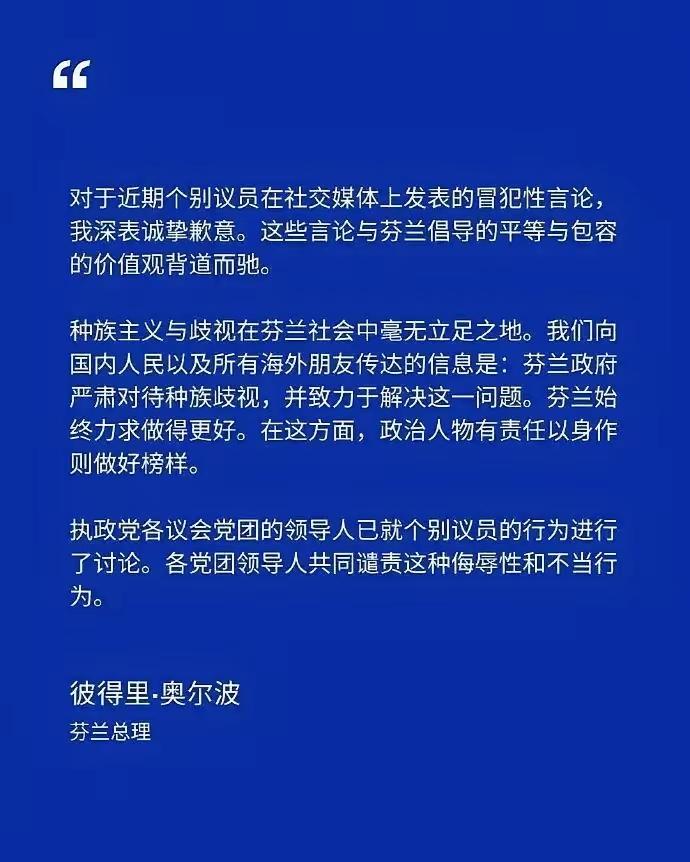 因为芬兰议员的歧视行为,芬兰总理正式向中日韩民众道歉。 我的关注点其实不在他的道歉本身。说实话,我除了看到这些小丑的幼稚丑态以外,没有一点情绪波动。 但我想说的是,这个议员的动作明显是歧视东亚东南亚所有黄色人种,但是,他只对中日韩民众道歉了。朝鲜蒙古以及东盟各国都被忽略不计了。 国家强大了,别国家做错事了还会给你道个歉;国家弱小了,别人随意侮辱你了之后就当一切都没发生。 这就是这个世界的现实。 越南人就深刻地感受到,如果没有中国,美国都不会多看亚洲一眼。如果没有中国,越南人买杯星巴克都得踮起脚尖。 突然想起,为什么芬兰总理要道歉啊?你看我们自己的电影作品,呵呵。 点右上角关注我,我们一起去看这个魔幻的世界