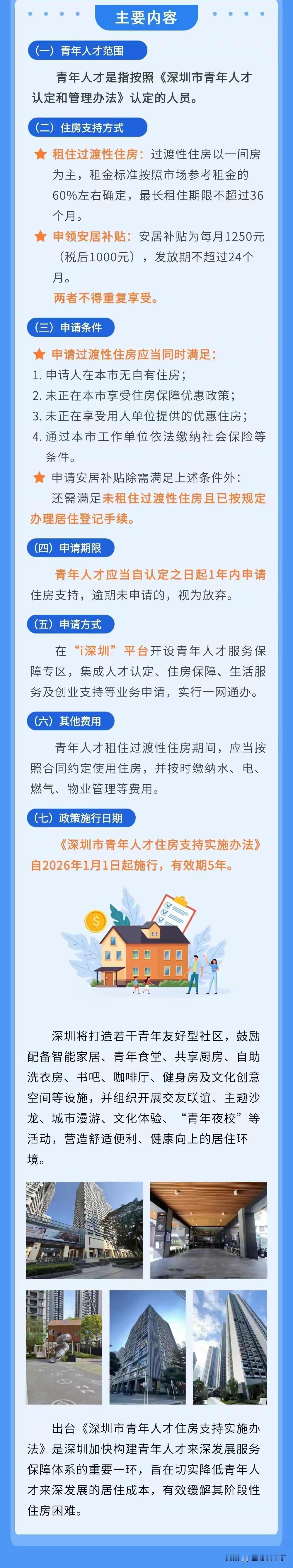 深圳为了吸引人才,留住人才又出新的优惠租房政策了,这次是面向青年人才政策核心是1、可以以市场价的60%申请过渡性住房,租住时间是3年;2、可以申请安居补贴,每月1250,但是要扣税,税后是1000元,发放时间最长24个月。深圳发展那么快是有底气的,动不不动就发各种优惠政策,营商环境又好,周围城市的人才大多都会被虹吸过来。