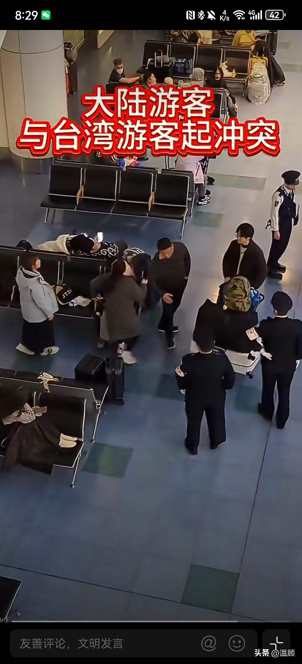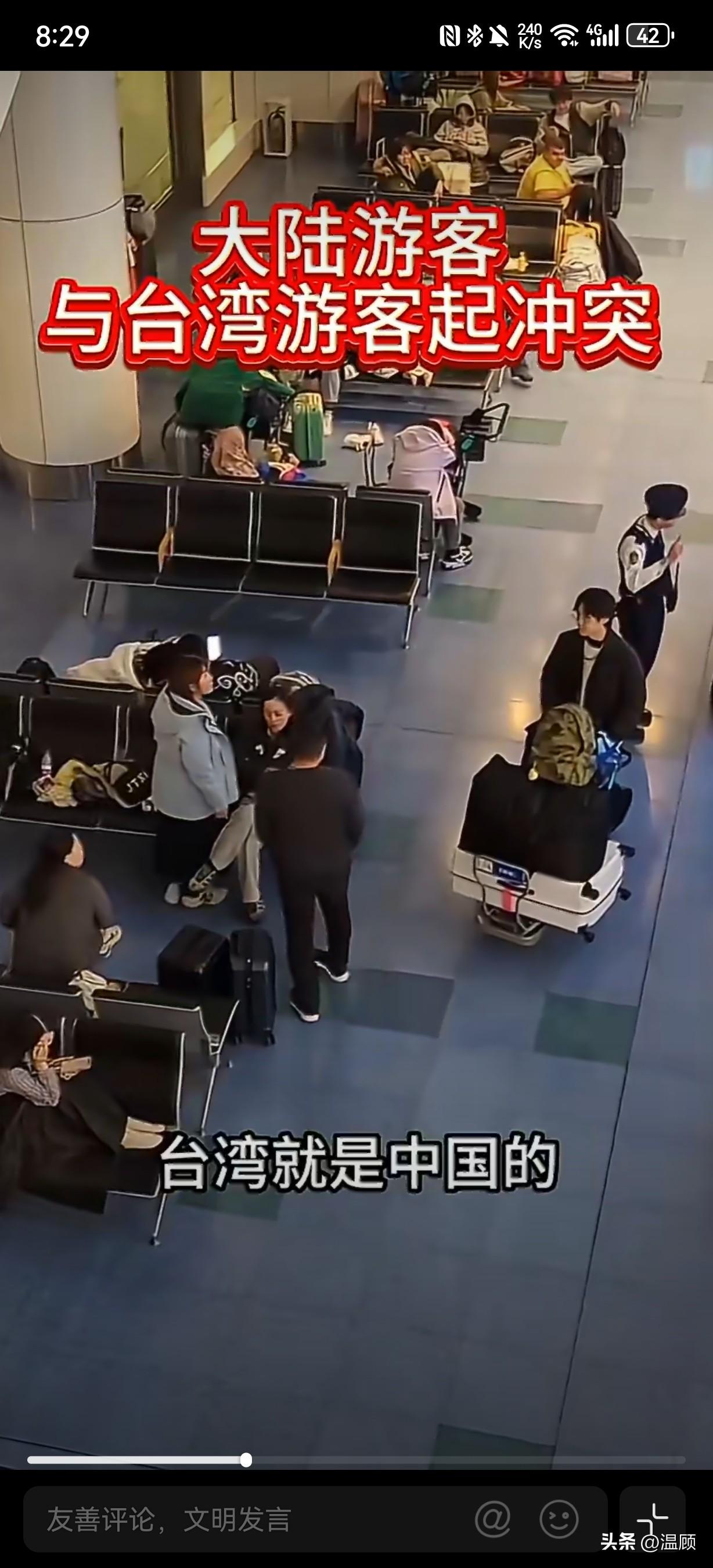 近日,日本东京羽田机场的候机大厅内,一场因占座问题引发的冲突在中国大陆游客与中国台湾游客之间爆发。起初,双方因座位归属各执一词,争执逐渐升级。期间,大陆游客面对台湾游客的态度,坚定喊话“台湾就是中国的!”,明确表达了对国家主权和领土完整的立场。 冲突过程中,台湾游客转而用日语向机场工作人员反映情况,试图寻求协助。这一行为引发大陆游客不满,当场直言“请说人话,不要说狗语”,双方的矛盾进一步激化。