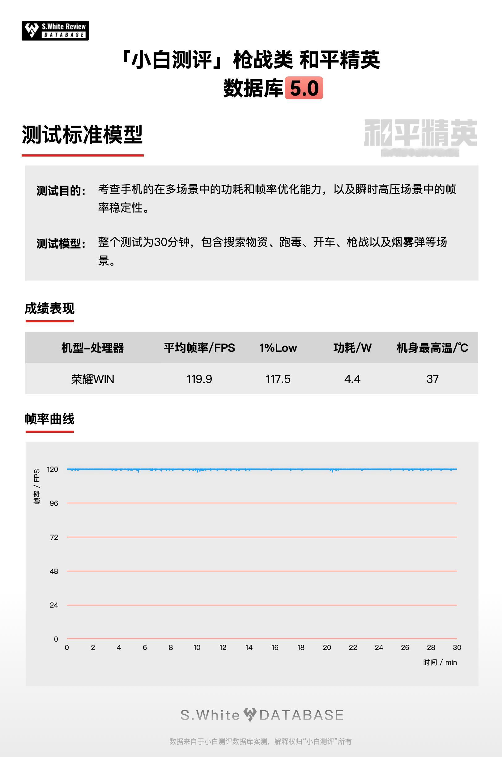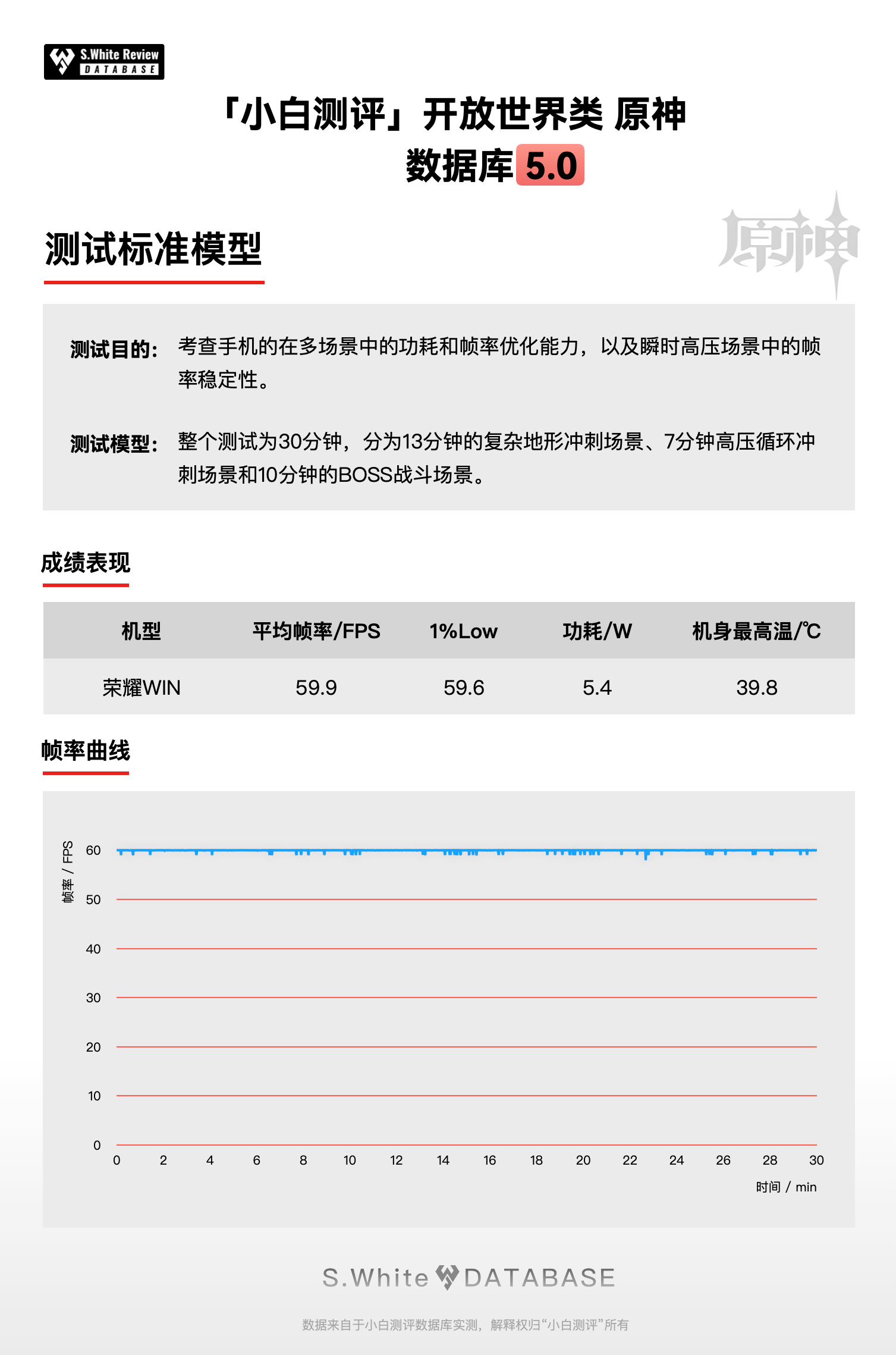 2025最后一台性能定位旗舰:荣耀WIN,搭载骁龙8 Elite Gen5,数据库5.0实测总结两个点:温度突出、游戏表现亮眼,详情如下:「多场景」1、MOBA类-王者荣耀:平均帧率120FPS(满帧120),1%Low帧120,功耗4.4W,机身最高35.9℃;2、枪战类-和平精英:平均帧率119.9FPS(满帧120),1%Low帧117.5,功耗4.4W,机身最高37℃;3、开放世界类-原神:平均帧率59.9FPS(满帧60),1%Low帧59.6,功耗5.4W,机身最高39.8℃;「超高压场景」1、100分钟持续游戏-王者荣耀:平均帧率120FPS(满帧120),1%Low帧119.9,功耗4.5W,机身最高37.1℃;2、超高负载-星穹铁道:平均帧率59.9FPS(满帧60),1%Low帧58.4,功耗7.7W,机身最高45.6℃;后面有详细实测视频,大家可以期待一下它的整体配置和表现。(备注:数据库5.0分为多场景和超高压场景,测试目的参考配图)小白测评数据库5.0环境温25℃±0.5℃,屏幕亮度350nits,性能模式
