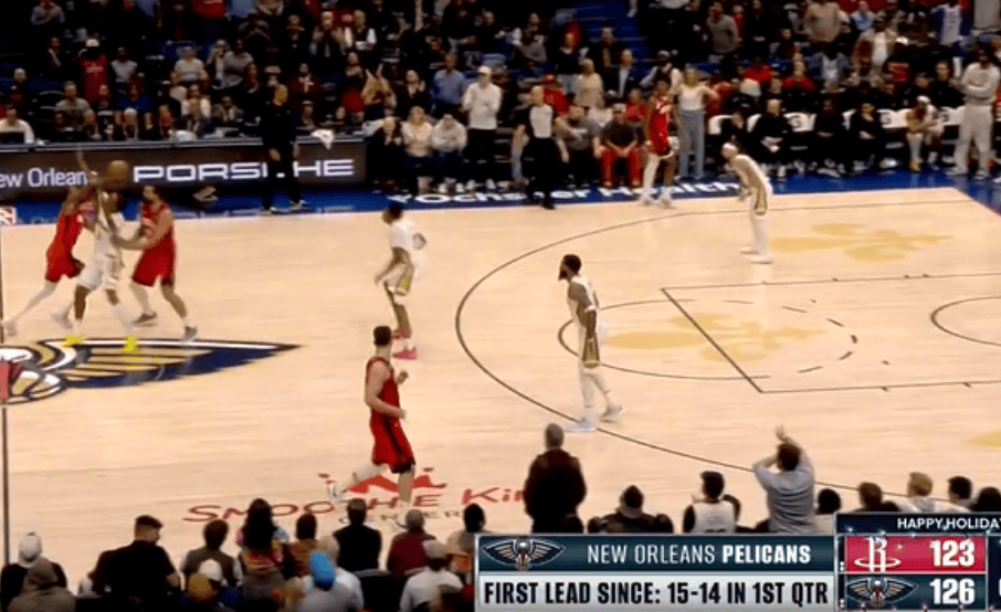 比赛第四节,萨迪克-贝命中三分,鹈鹕自开场15-14之后首次取得领先。