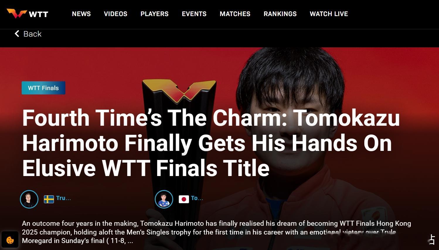 wtt年终总决赛25张本智和 “我真的不敢相信自己做到了,我是这个赛事的冠军。我想明天和我的团队一起庆祝这场胜利。。。我对球迷只有感激之情。感谢来到现场的球迷,感谢观看我的比赛直播并通过媒体支持我的所有人。谢谢你们一直以来的支持。我希望能与你们分享更多这样的胜利时刻,我也会更加努力,让这些时刻不断发生。”—— 张本智和····【WTT官网文章】《第四次终成正果:张本智和终于将梦寐以求的 WTT 年终总决赛冠军收入囊中》历经四年的等待,张本智和终于实现了自己的梦想。在周日进行的决赛中,他以一场情绪澎湃的胜利击败特鲁尔斯·莫雷加德(11-8、5-11、11-9、10-12、14-12、11-2),首次在职业生涯中高举男单冠军奖杯,正式加冕 WTT 香港年终总决赛 2025 冠军。时隔14个月再度交锋,这一次张本智和与莫雷加德所面对的赌注前所未有之高。WTT 年终总决赛冠军,是只有这项运动中最顶尖的选手才敢奢望的荣耀,而对两人而言,这一战都带着强烈的个人意义。对张本来说,他在2021年、2022年和2024年三次倒在决赛门槛前,心中始终憋着一口气;而莫雷加德则迎来了创造历史的机会——成为首位捧起 WTT 年终总决赛单打冠军奖杯的欧洲选手。当两位球员走向球台时,现场的仪式感扑面而来。从第一分开始就火力全开的张本智和,振臂怒吼、紧握拳头,早早为比赛定下基调。开局前五分中,日本天才拿下了其中四分,形势一度对对手极为不利。但以顽强斗志著称的莫雷加德迅速反击,将比分反超至5-7。两人随后你来我往,分分必争,凭借世界级的进攻能力不断点燃香港体育馆内观众的热情。张本最终拿下关键的首局,但显然他的瑞典对手绝不会轻易退让。第二局双方一路胶着至3-4,随后莫雷加德一记沿直线轰出的凶狠正手擦边球,促使张本申请 TTR 挑战。然而回放判定挑战失败,比赛势头随之彻底逆转,莫雷加德乘势追击,将总比分扳平。两位决赛选手之间几乎没有差距,关键分的压力被推升到全新高度。每一回合都在逼迫彼此触及极限。张本凭借一记凌厉的反手横向反击拿下第三局;第四局再次战至白热化,莫雷加德火箭般的进攻接连轰出,震耳欲聋的欢呼声回荡在整个场馆。这是一场真正的巅峰对决,空气中弥漫着期待的气息。第五局在整场比赛中的意义无比重大,而事实也正是如此。莫雷加德在 10-7 时领先并拿到三个局点后转向教练席庆祝,仿佛胜利在望。但张本顽强追至9-10。作为 2025 欧洲大满贯(瑞典站)冠军,莫雷加德请求暂停,试图“冻结”比赛,却未能奏效。两人的情绪反差此刻被无限放大。张本尽情庆祝,而莫雷加德则沮丧地回到场边。从那一刻起,比赛几乎变成了一边倒。终点线就在眼前,张本再次提升强度,爆发出最后一波能量,用第六局锁定胜局。终于完成了这项长久以来未能实现的壮举,张本智和跪倒在地。赛后,他拥抱了泪眼朦胧的莫雷加德,这位日本新星终于征服了 WTT 年终总决赛的舞台。以赛季中最具分量的冠军之一收官,这注定是张本智和永生难忘的一天。“我真的不敢相信自己做到了,我是这个赛事的冠军。我想明天和我的团队一起庆祝这场胜利。特鲁尔斯拥有非常多的技术,他的正手和反手都很强,不仅能拉反手,还能削、能挡。正是他在战术上的细微变化让我感到非常困难,这也是他伟大的地方。我对球迷只有感激之情。感谢来到现场的球迷,感谢观看我的比赛直播并通过媒体支持我的所有人。谢谢你们一直以来的支持。我希望能与你们分享更多这样的胜利时刻,我也会更加努力,让这些时刻不断发生。”—— 张本智和至此,WTT 系列赛 2025 正式落下帷幕。一个充满戏剧性转折的赛季已经写入历史,但高能对决并不需要等待太久。2026 赛季将以激动人心的方式揭幕:卡塔尔将迎来 32 位世界顶尖的男女单打选手,参加首届 WTT 冠军赛·多哈 2026(2026 年 1 月 7 日至 11 日)。(机翻)P1:特鲁尔斯·莫雷加德在这场精彩绝伦的决赛中拼尽了全力。P2: 一图胜过千言万语。