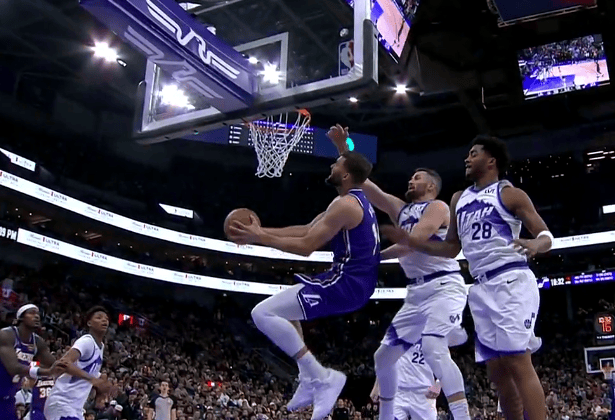 克勒贝尔拉杆上篮被乐福打到面部,裁判回看吹罚普通犯规